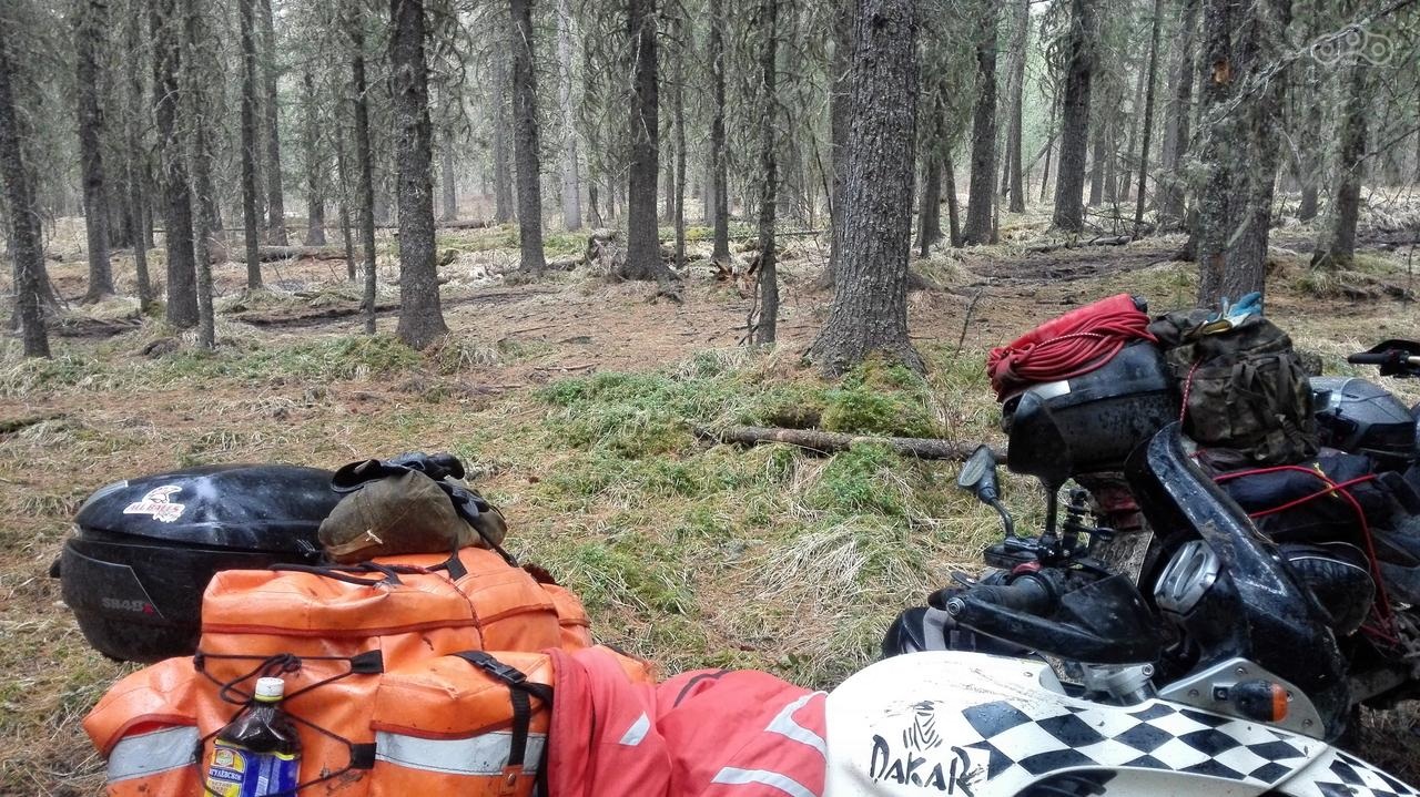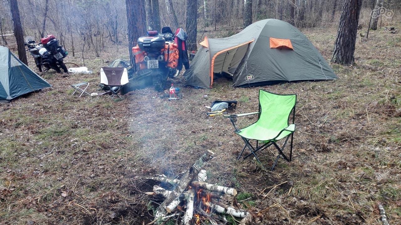 Поскидали мы вещи на своих коней и поехали в лес. Там все воюющие разделены на два базовых лагеря, один лагерь находился на въезде в лес, а второй где-то в его середине. Угадайте какой из лагерей был наш? Правильно – в самой жопе. Любой эндурист легко себе представит во что превращаются весенние лесные дорожки после хорошего дождика. Мне наконец то выпал шанс испытать своего баварца на очень сколькой грязи с огромными колеями. До этого я ездил на Рейсере с весом около 150 килограмм, а тут монстр весом в 200, плюс тяжеленный баул кило на 60 и огромный задний кофр на 15-20 кг. Ох и натерпелся я там, в горку по грязи еле ползёт, всё время норовит сорвать задницу и завалиться, а держать его пипец как тяжело. В этот момент я пожалел, что не поехал на китайце и еще понял, что про наши гряземесы возле дома с Саней придётся забыть. Кое как с двумя перекурами я добрался до места стоянки.
