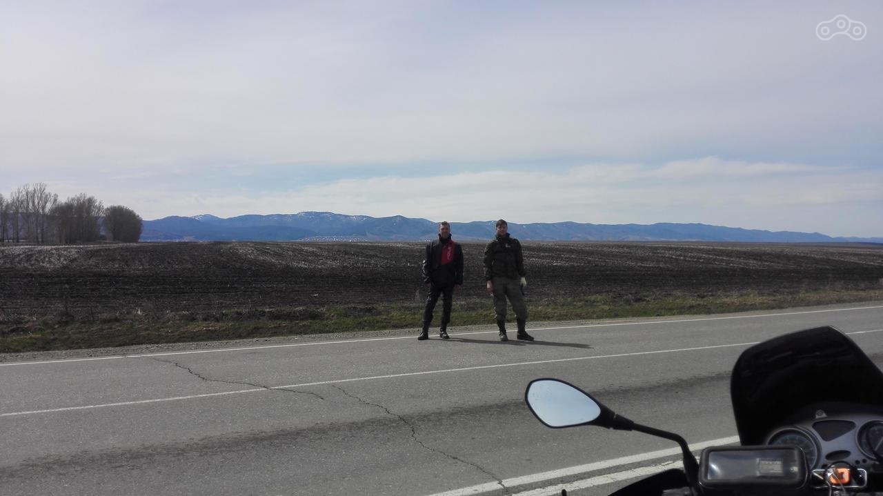 Двигаясь дальше, поймал себя на мысли, что мы едем по серой полоске асфальта, вокруг нас пожухлая прошлогодняя трава да голые и страшные деревья, торчащие из обочин как плохо сплетенные веники какого-нибудь пьяного дворника, а над головой мрачное свинцовое небо. А душа то у меня прям песни орёт, подпевая музыке в шлеме. Так мне было хорошо.