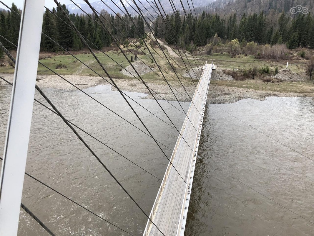 Проехав какое-то время, мы заметили справа мост, к которому вела грунтовка. Решили свернуть и посмотреть, что за мост такой и куда ведет. Скажу честно, он ввел нас в лёгкий ступор. Мост был сделан монументально, прям на века и при этом был пешеходным. Рядом стояли несколько дорогущих джипов, оставленных здесь судя по всему давно. С другой стороны моста так же шла отличная грунтовка. Мы с Алексеем начали строить разные предположения и открыв навигатор начали искать базы отдыха на другой стороне, но таковых обнаружить не удалось. Вдоволь нафотались, Лёха даже на верхушку моста залез, и поехали дальше.