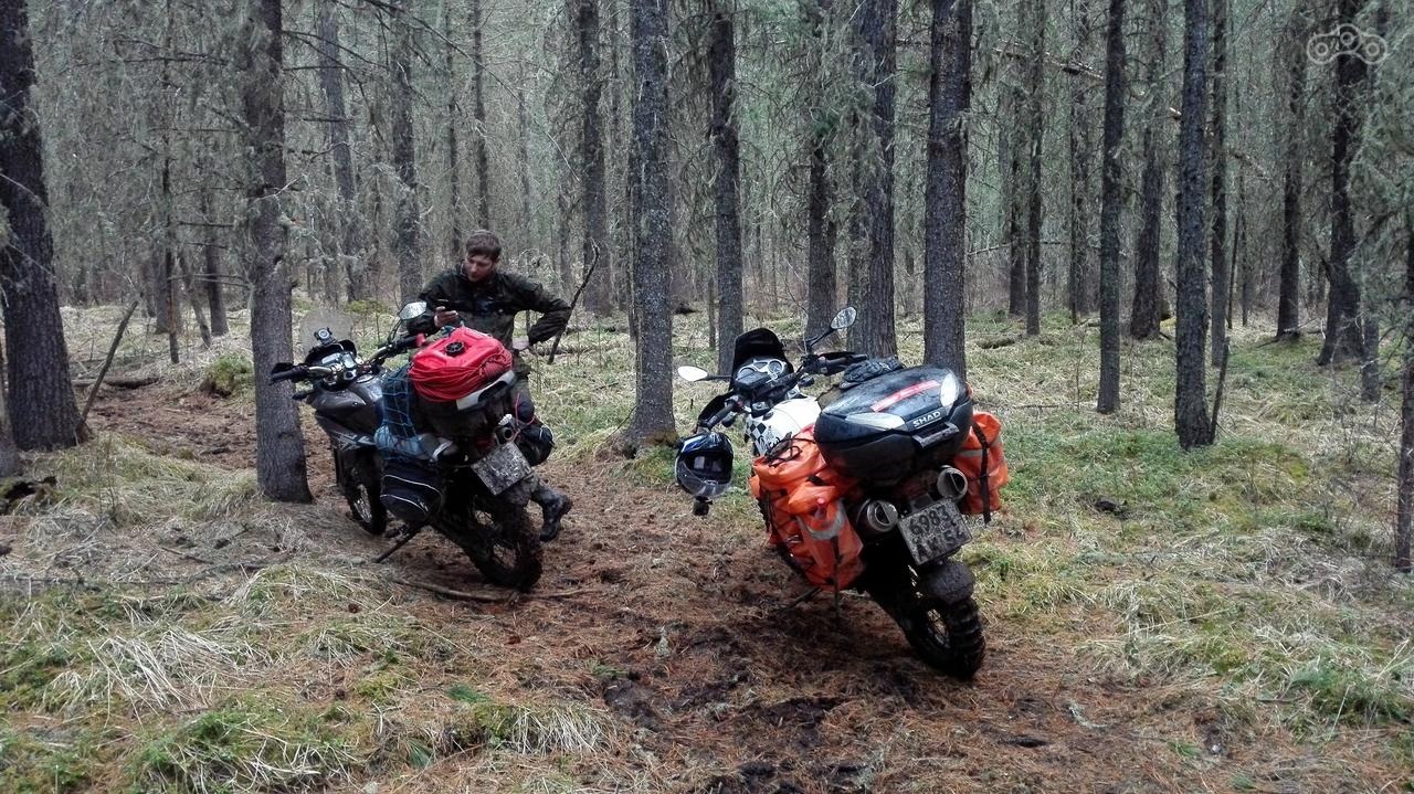 Лужи вперемешку с грязью, торчащие ото всюду мокрые корни. По такой грязи надо ехать ходом, перепрыгивая поваленные деревья. Вот только Лёха ехал исключительно медленно, постоянно останавливаясь и пытаясь отыскать тропинку. А я на своей не самой свежей задней резине, напоминающую дорожный слик и вовсе не мог даже тронуться уперевшись в очередной корень, сильно напоминая огромную и тяжёлую корову на льду. Силы мои от такого эндуро заканчивались прямо на глазах. Удерживать вертикально это чудо было всё сложнее и как итог я его завалил. Попытался поднять сам, понял, что вот сейчас сдохну и позвал на помощь друга. Кое как мы его подняли и в этот момент пришло понимание еще одно минуса моей огромной сумки. Первое – если ты на неё упал, то снять её и поднять мотоцикл на легке – нельзя. Второе – она полностью перекрывает заднюю ручку, за которую нужно схватиться для подъёма. Поехали дальше. Я всё время то застревал, то падал и это было уже совсем не смешно.