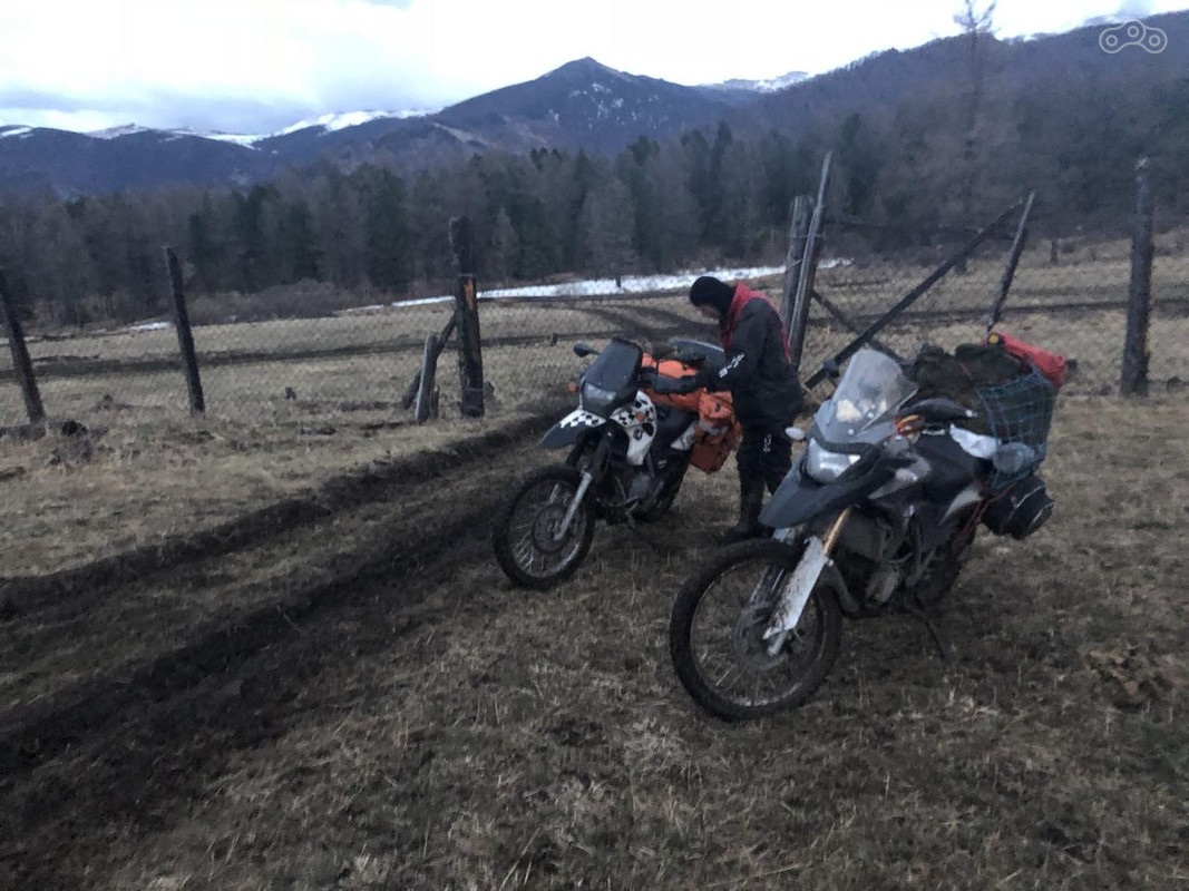 Вся она была серо зеленая, покрытая ровным слоем свежей травки. Невероятное количество огромных чёрных колеей на этой травке, сходившихся в одну точку возле леса, где в заборе были ворота, наводили на две мысли. Во-первых - по этой чудно полянке проехать без боя не получиться, а во-вторых – там, где сходятся все колеи должна быть полная жжжж. Предчувствие меня не обмануло. Оглядев поляну, мы решили, что попробуем прорваться по правому краю. Проехав метров сто, я начал потихоньку уходить под землю. Щедро закидав задний кофр жирной Алтайской землицей и перебирая ногами, мне всё же удалось развернуться и вернуться на исходную позицию. Оставалось только левое направление. Там нас ждали глубоченные колеи идущие перпендикулярно нашему направлению движения. Преодолевать их приходилось с разгона, иначе гарантированно можно было повиснуть брюхом на середине этих «дорог». Кое как мы все же добрались до леса, где нас ждал забор, ворота в этом заборе и несомненно та самая жжжж про которую я думал ранее. Огромная замешенная ЗИЛами и наполненная до самых краёв водой «лужа». Я даже глубину мерить не стал, и так было понятно, что тут мы не проедем. Пока я стоял и курил, Лёха поехал вдоль забора в надежде найти лазейку. И нашел-таки. Метрах в трёхстах можно было отмотать кусок забора и проскочить. Потратив на это еще кучу времени, мы добрались до леса. Дальше шла только одна колея, но зато какая. Если в неё заехать, то выехать уже не получиться. Сусанин пошел на разведку в лес, а стоял и думал, что время уже около семи вечера и фиг его знает, что нас там ждёт впереди.