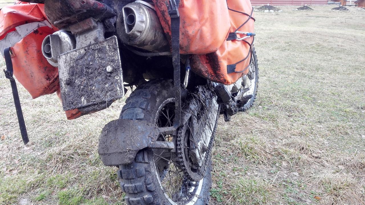 Тут можно написать отдельную историю про то как я его смотрел, купил, а потом чинил. В двух словах мне достался мот, повидавший всё на свете. Погнута передняя вилка, не то переднее колесо, а про внешний вид я вообще молчу (но это пофиг, эндуро же). И вот представьте сколько интересного я пережил за эти пару недель экстренно исправляя всё на свете, а ведь еще надо было сварить на него багажную систему под мою новую сумку. А еще все эти развлечения проходили с почти полным отсутствием финансов, так как все было выложено за мот.