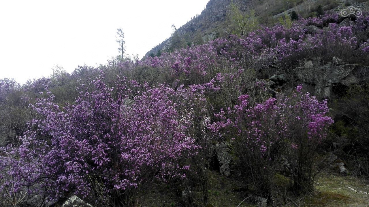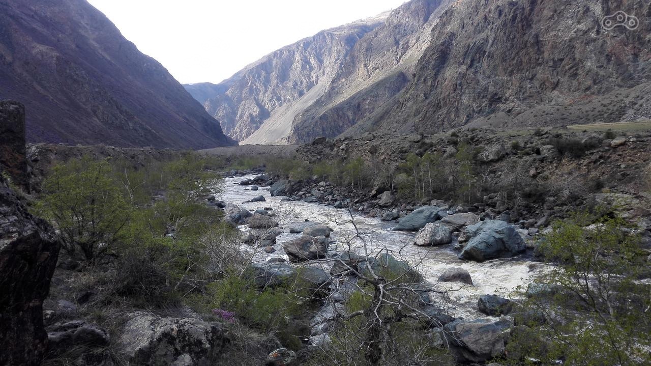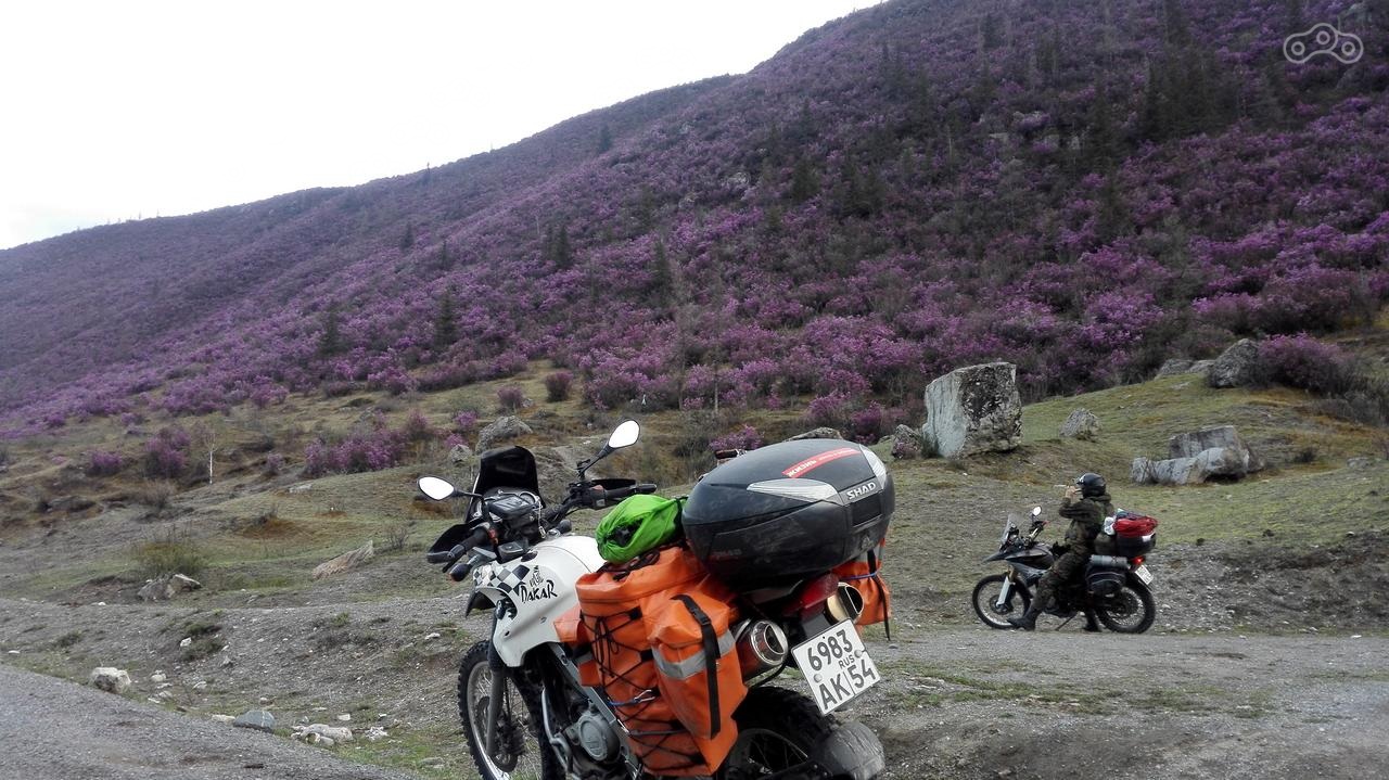 Моё небольшое разочарование перевалом было с лихвой компенсировано великолепной дорогой идущей вдоль реки Чулышман. Такие дороги словно созданы для эндуро туризма. Я специально отстал от нашей группы что бы насладиться всей этой красотой одному, сбавил скорость и начал крутить головой, пытаясь впитать в себя как можно больше чуда этого места. Кстати, именно здесь предстал перед нами своей фиолетовой феерией цветущий маральник.