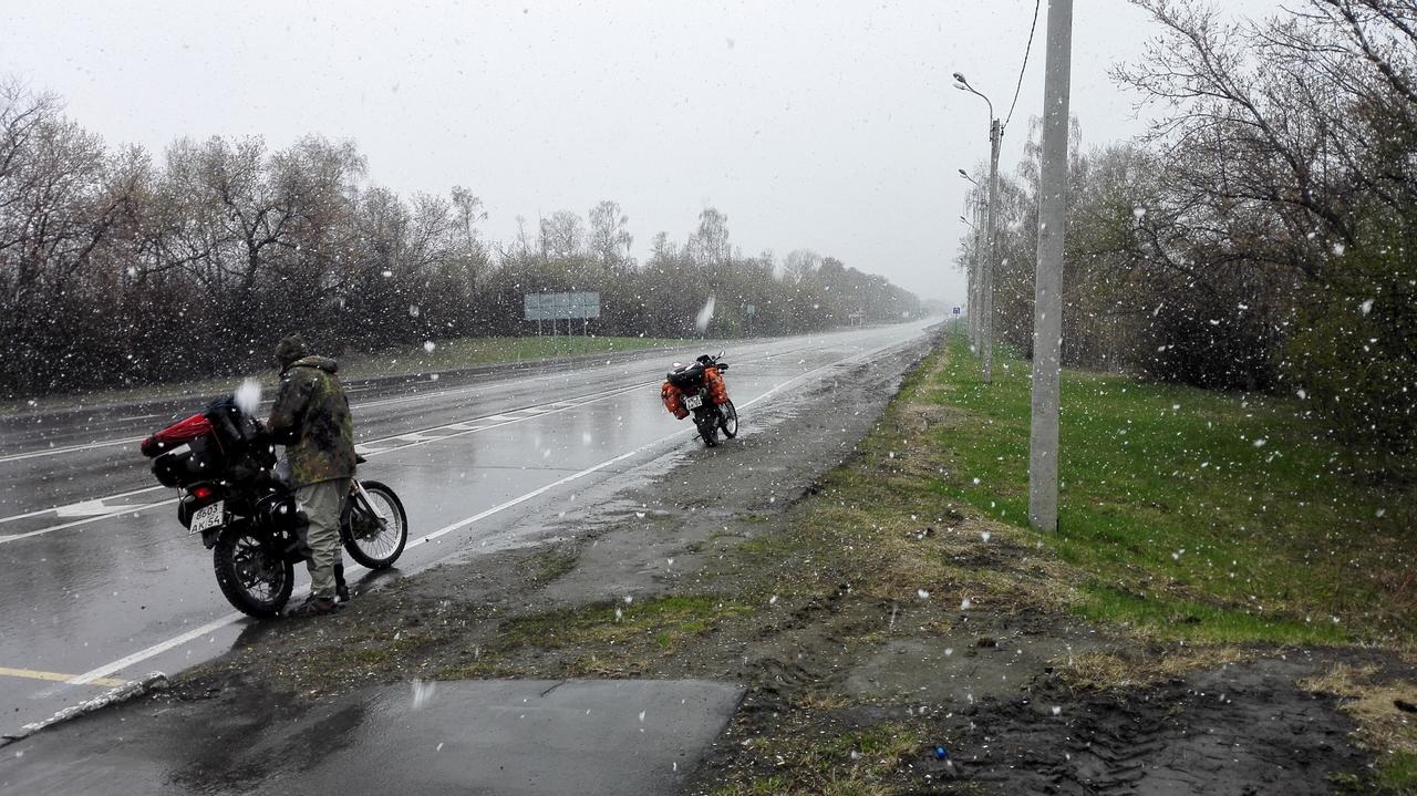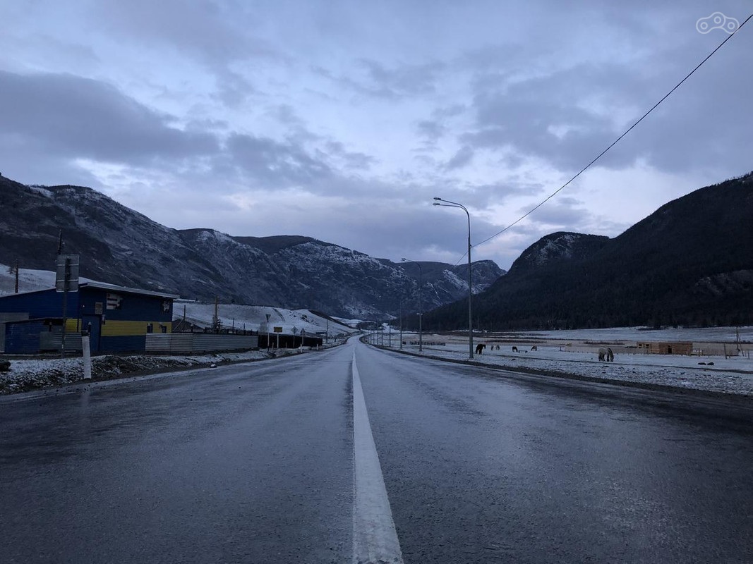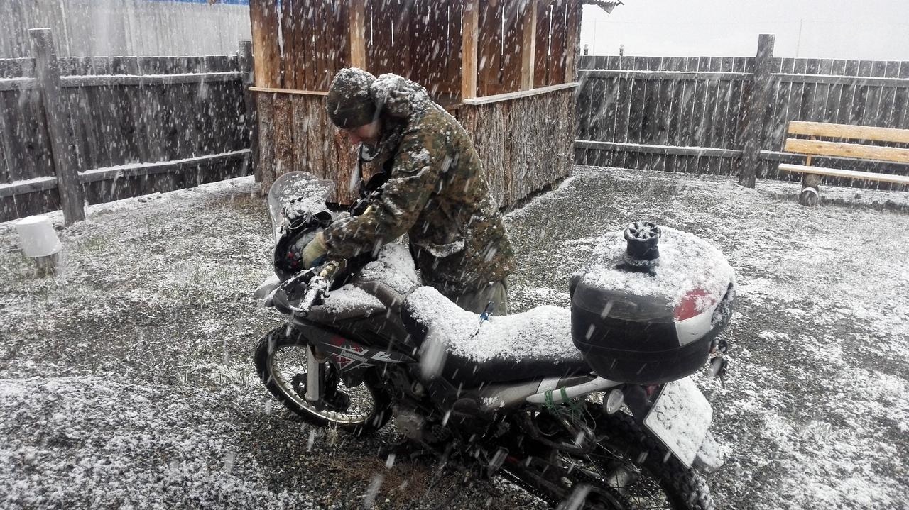 Погода в этот день не особо радовала. Всё небо было затянуто хмурыми свинцовыми облаками и это не предвещало ничего хорошего. Довольно скоро мы остановились на перекур, и я начал напяливать на себя всю одежду, что была у меня с собой. Поскольку начинался дождь со снегом, надел и штаны от ОЗК. Ох и офигенная же это вещь. Стал похож на Карлсона, только без пропеллера. Лёха глянув на термометр сказал, что мы перевалили за ноль и на улице уже минус. Ну вот и славно, новый рубеж в наших путешествиях пройден. Впереди был Семинский перевал. На верху снег валил уже серьёзно и похолодало еще сильнее. Ехать по скользкой дороге было немного страшновато, но мы справились. В такие моменты ощущаешь себя оленем Санта Клауса, несёшься себе в даль сквозь пургу и мороз весело позвякивая своими бубенчиками.