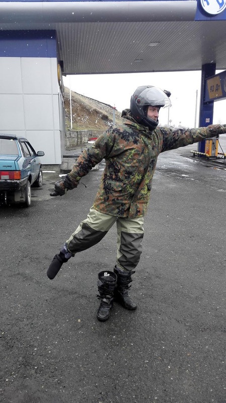 Оделся и мы поехали дальше. Вскоре опять остановились и он снял мотоботы и одел вместо них кроссовки. Всё-таки не влазит нога в вейдерсах в мотобот, точнее влазит, но её сдавливает так, что кровоток снижается и ногам становиться еще холоднее. Так он с мокрыми ногами и ехал до самого Новосиба. Как не заболел после этого ума не приложу.