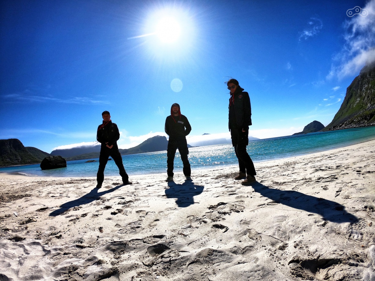 Следующей намеченной точкой был пляж c прекрасным запоминающимся названием Haukelandstranden, но добирались мы туда очень медленно, потому что по пути встречались еще несколько таких же красивых пляжей с белым песком, голубой водой и нереальными видами. На одном даже были серферы. В каждом поселении замечали деревянные сооружения, на которых сушилась рыба — одна из визитных карточек Лофотенов. Встречались и рыбные фермы.