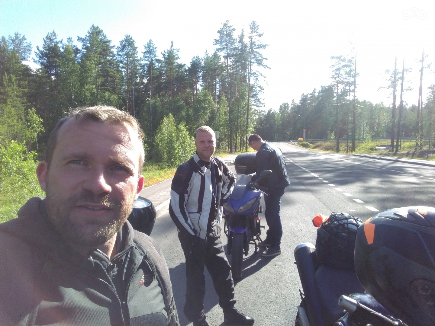 Мы же едем дальше вдоль восточного берега озера. Наш план к вечеру быть в районе Лодейного Поля. Есть, как минимум 2 пути туда добраться. Короткий - вдоль берега через Пяткаранту, Салми и Видлицу. И подлиннее – по А-121 через Пряжу. Мы, естественно, настроились на первый, который, помимо прочего, сулил продолжение захватывающих видов. Однако, свернув в районе Ляппясилта (ох уж это великий и могучий финский) мы попали на путь, который порадовал бы только того самого владельца Африки. Старый разбитый асфальт заставлял задуматься не только о самочувствии мягких частей тела, но и о здоровье мотоцикла. Ехать так почти 200 км совсем не хотелось. На заправке поинтересовались у местных, и они подтвердили, что до Олонца вся дорога такая. Возвращаемся на А-121. Тут, как раз с асфальтом полный порядок. Широкая прямая и абсолютно пустая трасса, окружённая непроницаемым «забором» из леса. Ни заправок, ни посёлков, ничего. Ехать тут откровенно скучно. Начинало вырубать, поэтому стали выкручивать для бодрости духа. МТ охотно едет в скоростном темпе. Даже на 160 мотоцикл мощно рвётся вперёд при открытии газа, шасси и тормоза в своей стихии. Главное держаться за руль, и лучше использовать беруши. За час такой езды слух начинает просить о пощаде. И ещё до заправки я доехал «на парах». В таком темпе бака уже едва хватило на 150 км. Немного более мощные и обтекаемые товарищи, естественно, шли не хуже. Но Фазер утомил крупного Саню посадкой, а РТ почему-то сожрал резину!