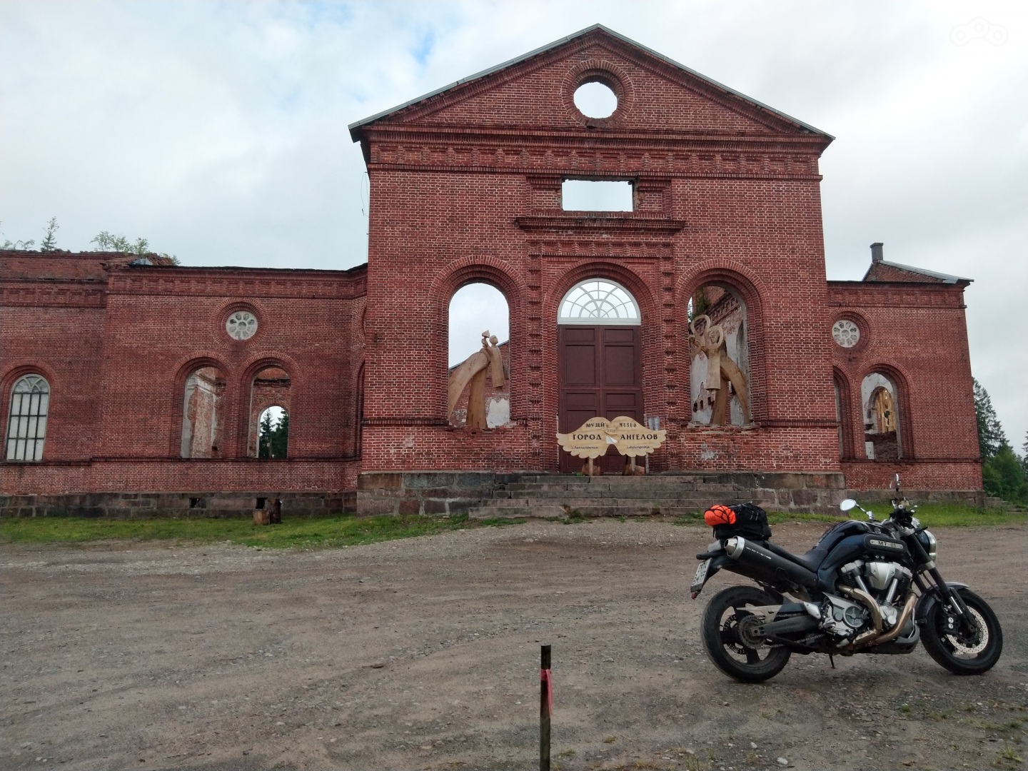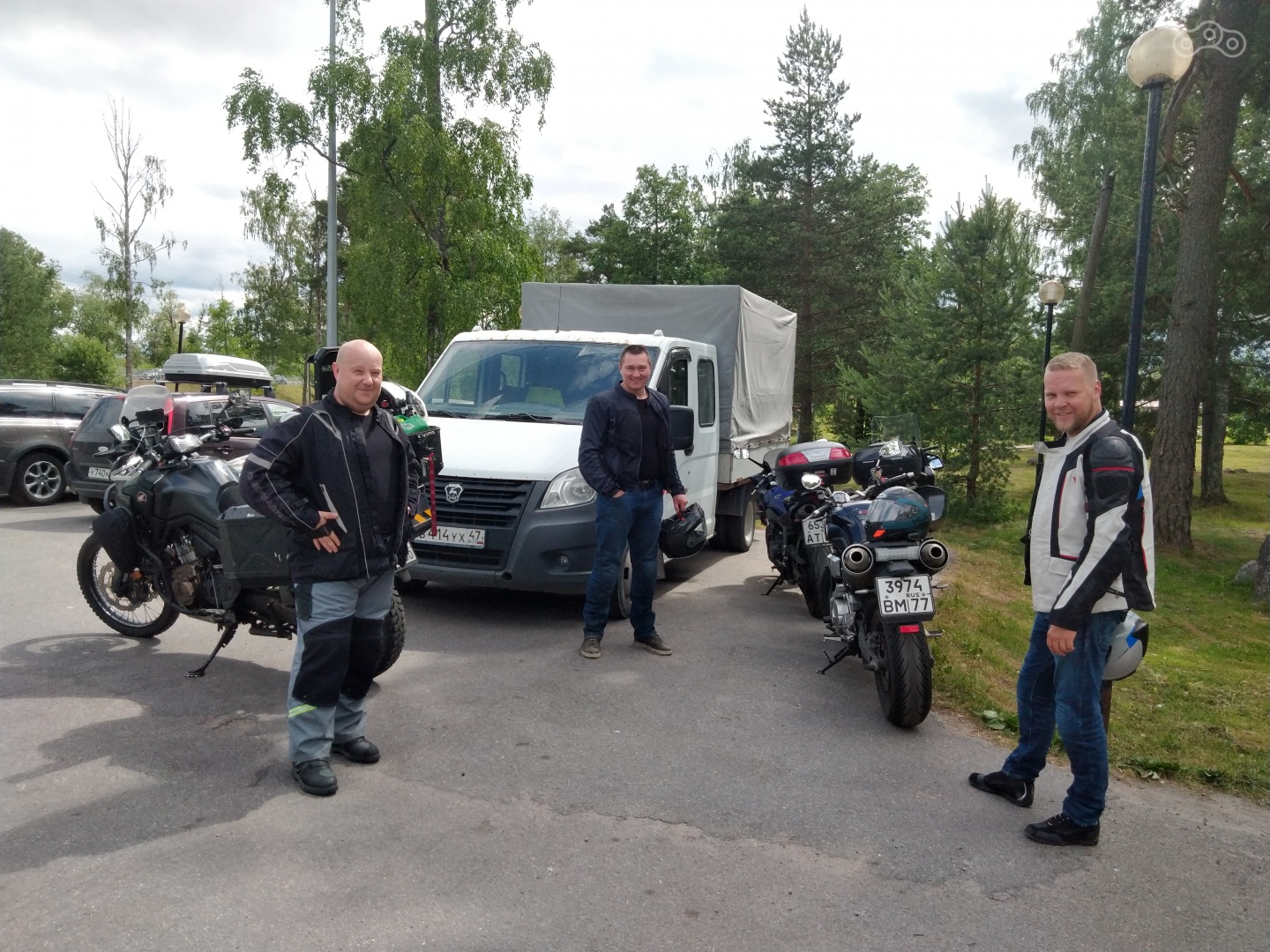 На следующий день планировался большой перегон через карельскую часть маршрута с заездом в пару интересных мест. Выехали рано, едем, ощущая холодное дыхание окружающей дорогу тайги. Моросит. Въезд в Карелию отмечен неожиданным стихийным блокпостом, но дежуривший солдатик оставил мотоциклетчиков без внимания. Постепенно погода прояснилась, а дорога прижалась к ладожскому берегу. И начавшийся серпантин оказался не хуже знаменитого Джубга - Сочи! Повороты, перепады, невозможность понять, что будет за следующим виражом, идеальный асфальт и при этом почти свободно. Настоящий бесплатный аттракцион и возможность понять, насколько ты “chicken”. Из нас троих я начал отставать. Первый раз ощутил, как сильно МТ не любит поворачивать. Чтобы его «завалить» нужно приложить заметные усилия. Вес, длинная база и широкий задний баллон очевидно не самые лучше помощники активному рулению. Да и необходимость постоянно переключаться при отсутствии какой-либо страхующей электроники отвлекает. Риск заблокировать заднее колесо инерцией огромного мотора на переключении вниз перед виражом вполне реален. Но сам процесс захватывает. Мотоцикл очень понятен и уверенно идёт в наклоне. Просто требует полного включения райдера. Хотя возможно дело как раз в нём, привыкшем ездить по прямой. Пока Саня с Тёмой соревновались в лихости, я пытался не отстать и отбивался от некоторых задетых автомобилистов, вспомнивших, что у них тоже есть мотор. Пожалуй, это был самый жёсткий, в хорошем смысле этого слова, дорожный мотопродубас на моей памяти.