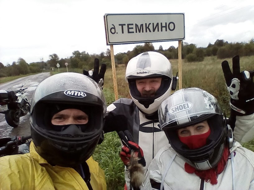 Деревня Тёмкино, помимо объекта религиозного наследия, запомнилась отвратительными дорогами везде, кроме федералки М1 и алкашами, которые завели разговор на околомотоциклетные темы (жрёт/прёт/водянка, да?) с финальным предложением дать денег на бухло собратьям-мотоциклистам. Кстати, совсем забыл представить участников прохвата: в шлеме Shoei Нати - стилист и ответственный за равлечения на нашем пути, в шлеме Schuberth Миша - главный стоматолог а также суперкарго (именно в его боковых кофрах ехала львиная доля нашего шмурдяка), и я - дизайнер и ответственный за навигацию и заправку (как единственный некурящий).