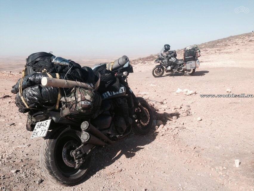 Ремонтировали сами, ребята из мастерской только помогали. Перед отъездом подарили им футболки с В. Путиным, они знают лидера нашей страны и поддерживают его. Начало пустыни. После Марракеша заехали в Агадир. Выехав из города, поняли, что цивилизация закончилась и началась нескончаемая Сахара, в ней города небольшие и похожи друг на друга, появляются как оазисы, нескончаемые пески и миражи. Чем южнее едем, тем сумасшедшей езда, на дорогах очень много полицейских. Люди в стране дружелюбные. Дорога пока хорошая.