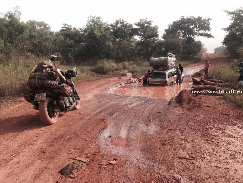 Дорог между Гвинея-Бисау и Гвинеей нет. Попытавшись проехать в Гвинею через один пост, нас не пустили, сказали что Эбола, поехали в объезд. Оказалось, что из Бисау вообще открыт только один выезд. Границы прошли хорошо без взяток, как тут принято. Дороги тут, конечно, оставляют желать лучшего. Но люди очень гостеприимные и жизнерадостные. Где бы мы не останавливались, сразу собирали публику из любознательных. Были и заминки. Я и Илюха прокладывали по пару раз колеса. Для такого бездорожья x4 низкий мотоцикл.