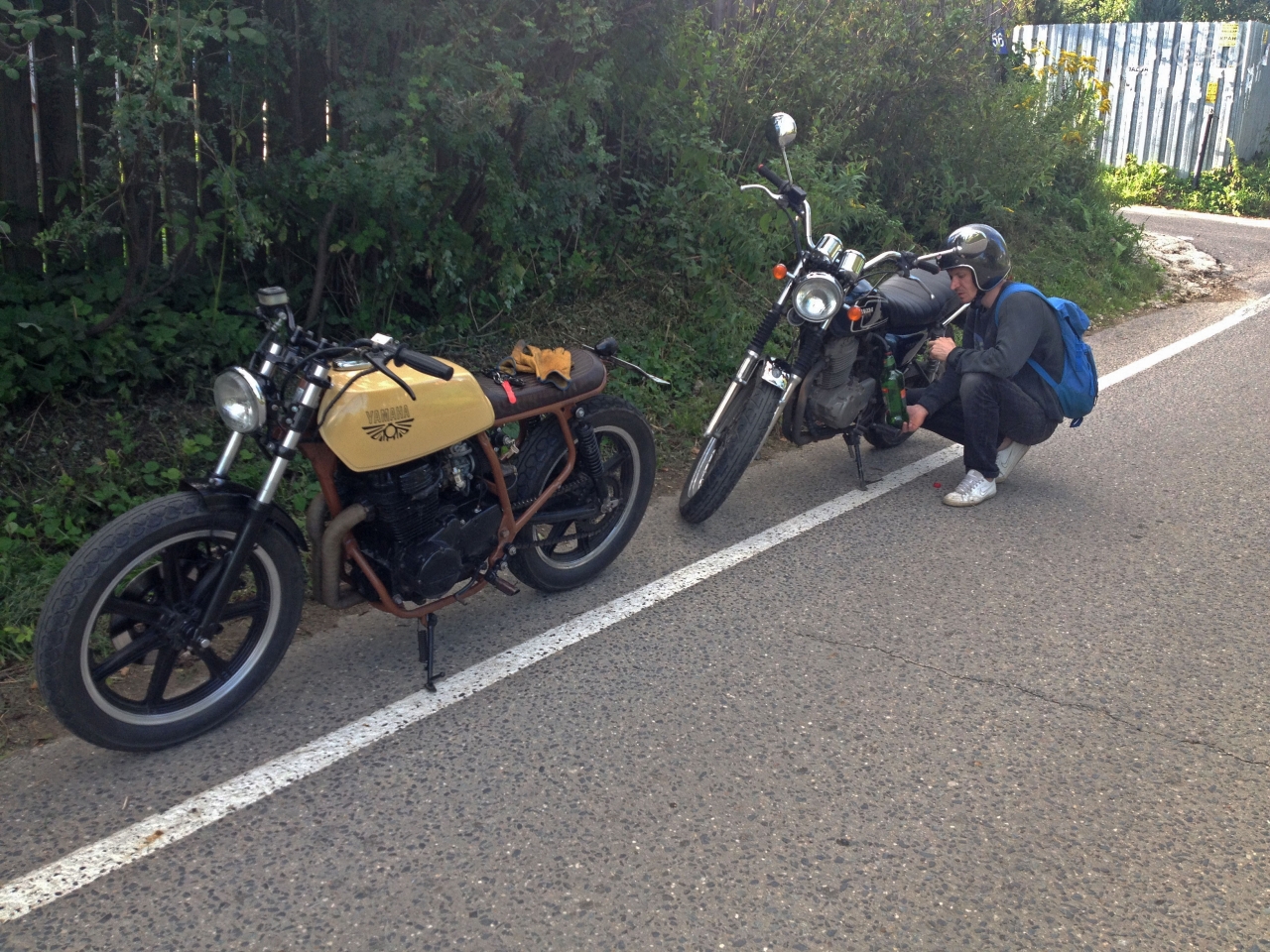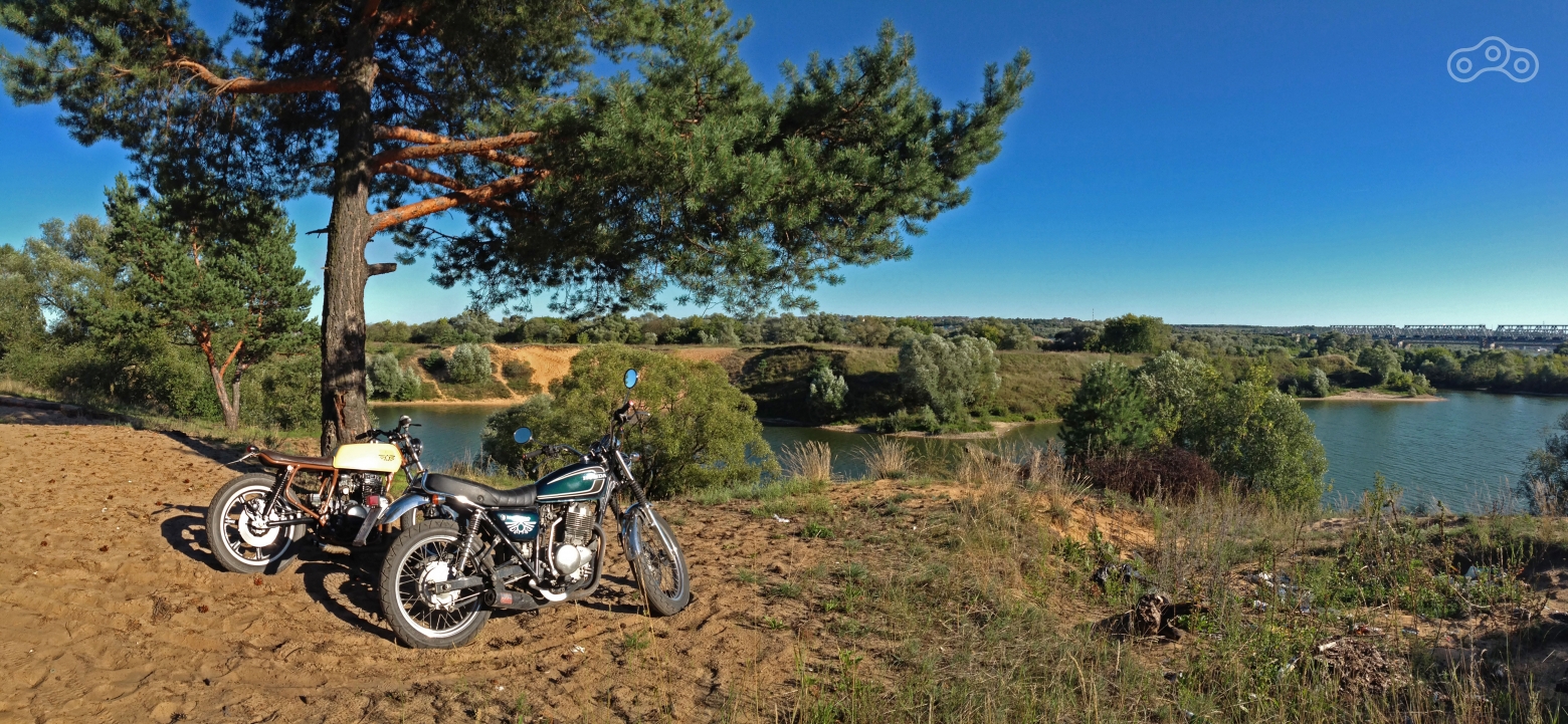 А целью нашей поездки было местечко на реке Оке,секретное,но как выяснилось,всем известное)) Добрались туда с некоторыми маленькими приключениями,одно из которых,за лето стало стандартным)))Закончился бензин в одном из мотоцикла))копаться в мусоре уже стало привычным делом))