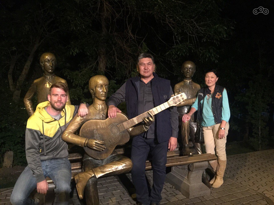 Жан с супругой и памятник Битлз в КокТюбе (Алматы).
