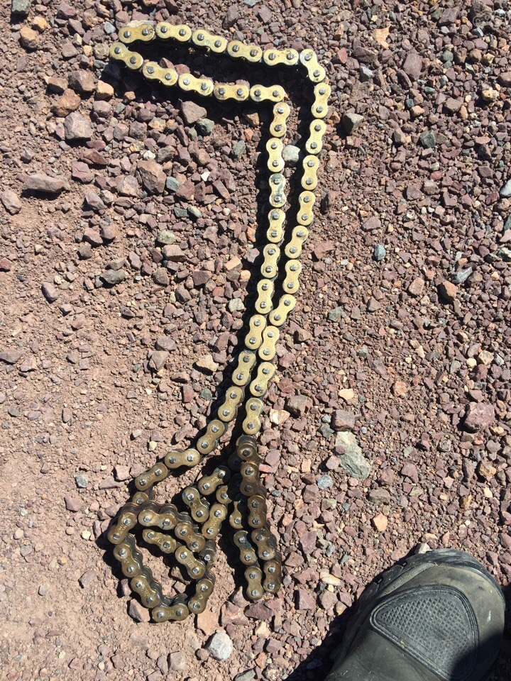 «Лёд тронулся, господа присяжные заседатели!» — говорил главный герой романов Ильфа и Петрова. Льда, конечно же в жарком Казахстане не было, а вот тронуться в этот день вполне могло получиться. Но обо всем по порядку. Ранним утром, попрощавшись с гостеприимными хозяевами дома в Алма-Ате, я выкатил на трассу в сторону озера Балхаш. Это уникальное озеро имеет одну интересную особенность — с одного берега половина озера соленное, а с другого — половина с пресной водой. Но, увы! Насладится водой в озере Балхаш в этот день мне было не суждено, мне выпало палящее солнце на трассе в 400 км от Алма-Аты и 200 км до одноименного города Балхаш. А именно на скорости в 120 км\ч рвется замок цепи и я, благополучно, скатываюсь вниз с горочки и встаю на обочине. Пройдя сотню метров, я подбираю с раскаленного асфальта цепь и возвращаюсь к мотоциклу. И хорошо, что цепь просто выкинуло со звезд, разорвав крышку, которая прикрывает ее от грязи, иногда последствия бывают гораздо хуже, например заблокированное заднее колесо на ходу. В Алма-Ату была отправлена смс, а я вместе с мотоциклом побрел до ближайшей чайханы, которая оказалась в 1,5 км от места поломки. Я вам скажу так, тащить по сорокоградусной жаре двухсоткилограмовый мотоцикл это тот еще кросфит =)