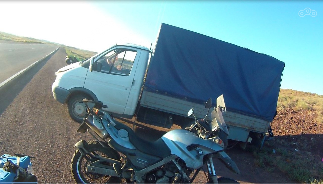Теперь нужно думать, как с этим всем жить дальше. Запас еды, газа и воды у меня был с собой, то есть пару дней я точно проживу автономно, да и чайхона и пачка налика в кармане не дадут мне помереть с голоду. Решений технических проблем тоже было несколько — либо я возвращаюсь на попутке в Алма-Ату, там ставлю новую цепь и повторяю свой выезд, либо же я двигаюсь в сторону Балхаша и пытаюсь там отремонтировать мою цепь, либо жду тут, пока мне передадут новый замок с Алма-Аты. Решено было действовать в нескольких направлениях сразу: Жан, за что ему большое спасибо, оперативно нашел нужный замок цепи и посадил его на маршрутку до Балхаша, я же начал ловить попутку в ту же сторону. К слову, все фуры здесь идут груженные фруктами и арбузами, так что задача довольно таки не простая. Остановились ребята на мотоциклах, которые возвращаются с Обской Волны в Новосибе, но к сожалению замка у них нет, через полтора часа остановились Киргизские байкеры, которые также возвращаются домой из Новосиба. У них кардан, а не цепь, но сзади идет «техничка», в которой уже стоит один мотоцикл и есть место под второй, так что можно без проблем доехать до Бишкека, там починиться и двинуть снова в путь. Но, мы смотрим только вперед! Останавливается парень, путешествующий на YamahaYbr125, он никуда не спешит и также путешествует в режиме EasyRide. Вместе с ним, мы останавливаем газель с екатеринбургскими номерами. Собственно в эту газель втроем за пару тройку минут закидываем мотоцикл, я сажусь в кабину, а Дима, именно так зовут парня на Юбре садится на хвост газели. Таким веселым составом мы доезжаем до города Балхаш, где поужинав в чайхоне, тут же раскидываем коврики и спальники в выделенной нам, хозяевами чайхоны, комнате. На телефон приходит телефон водителя и номер автобуса, на котором путешествует мой новенький замок для цепи и приедет он к 8 утра на центральный вокзал городка Балхаш.