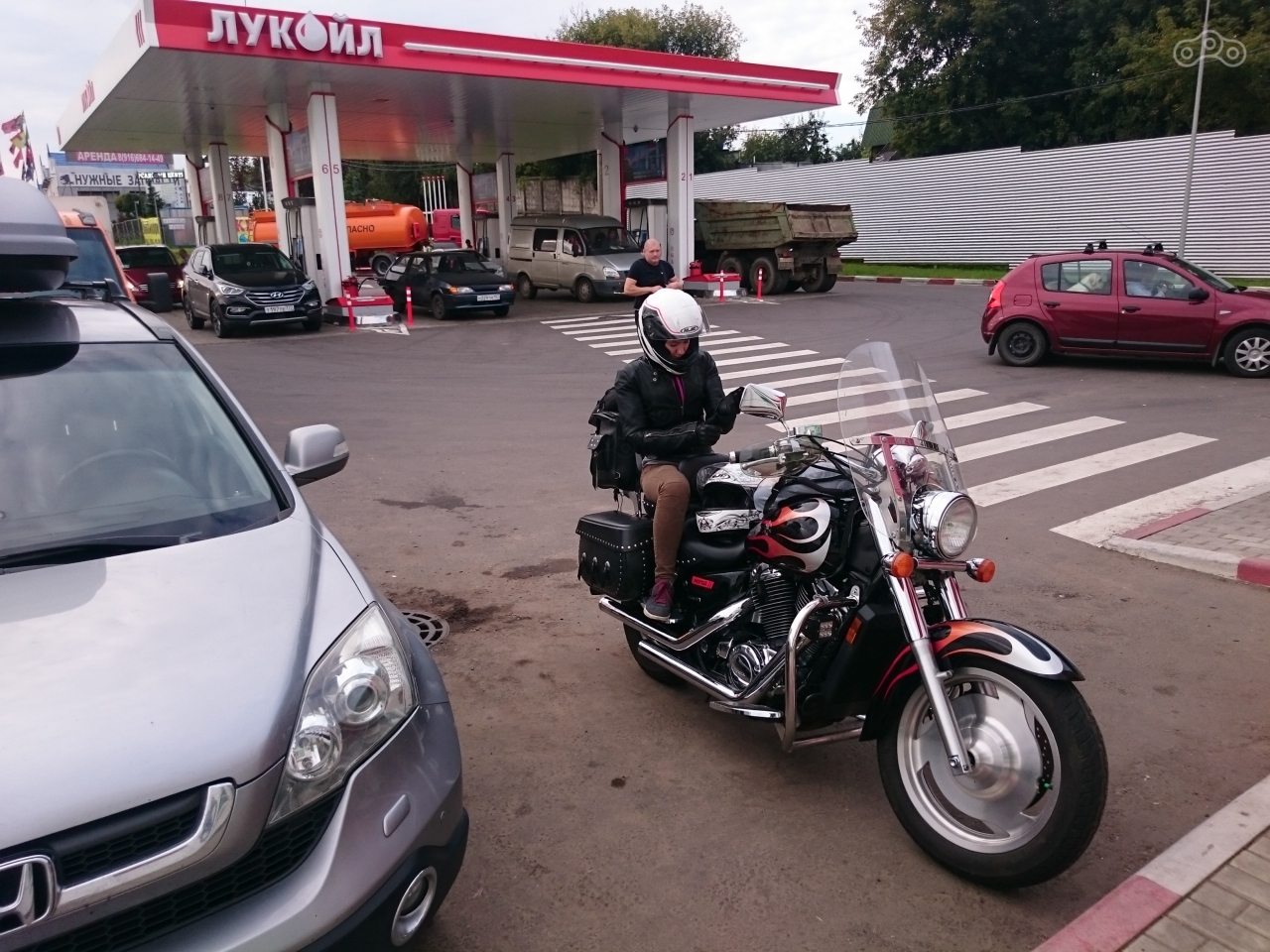 Когда мы с товарищем ездили на море на Космиче, у нас с собой были сухпаи и вода - отличная еда. Однако поскольку мотоцикл - не машина, еду мы решили покупать. Заправки Лукойл каждые 80 км по М-4 и ни разу нам не попался плохой бензин. Цены остаются на уровне Москвоских большую часть пути, так что мы просто заправляли мотоцикл и себя на этих комбинирвоанных точках.
