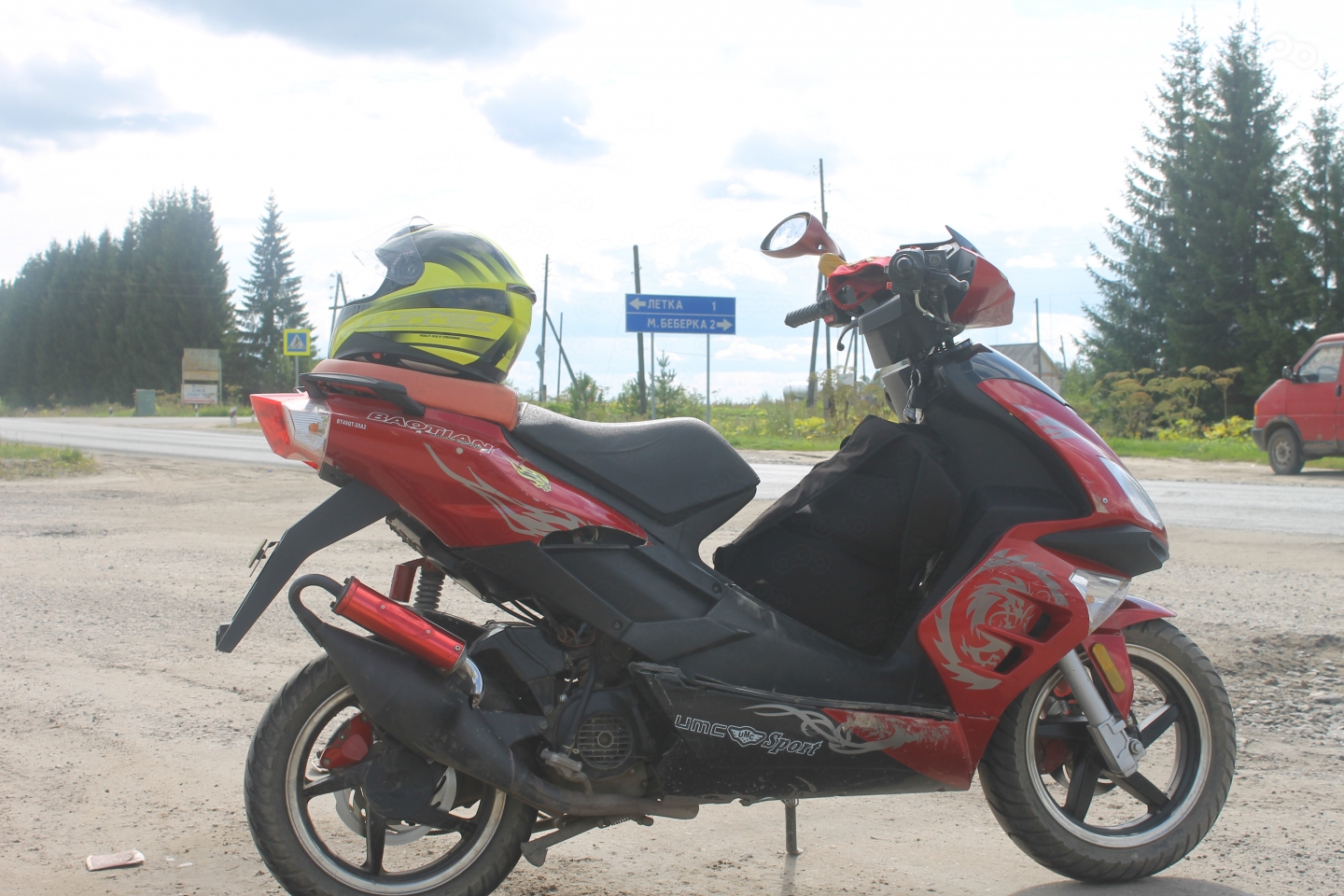 Самое интересное ждало меня на обратном пути. До дома 603км со скоростью 50км\ч под сильным дождем который начался сразу на выезде, он преследовал меня до самого дома, как будто туча шла на той-же скорости и делала те-же остановки. Представте себе фуру в ливень, которая вас обгоняет. Представили? А теперь представте 10,100,1000 фур. Визор запотевал и иногда прилетала порция воды в шлем. Двигатель работал на пределе своих возможностей. Под самым Сыктывкаром я встретил парня на внедорожном моте,(его я видел еще когда только ехал в киров и тут на обратном пути снова он) у него что то с клапанами и ехать он не может. Привязали его мот к скутеру и на буксире я тащил его до города. Скутер и это пережил.