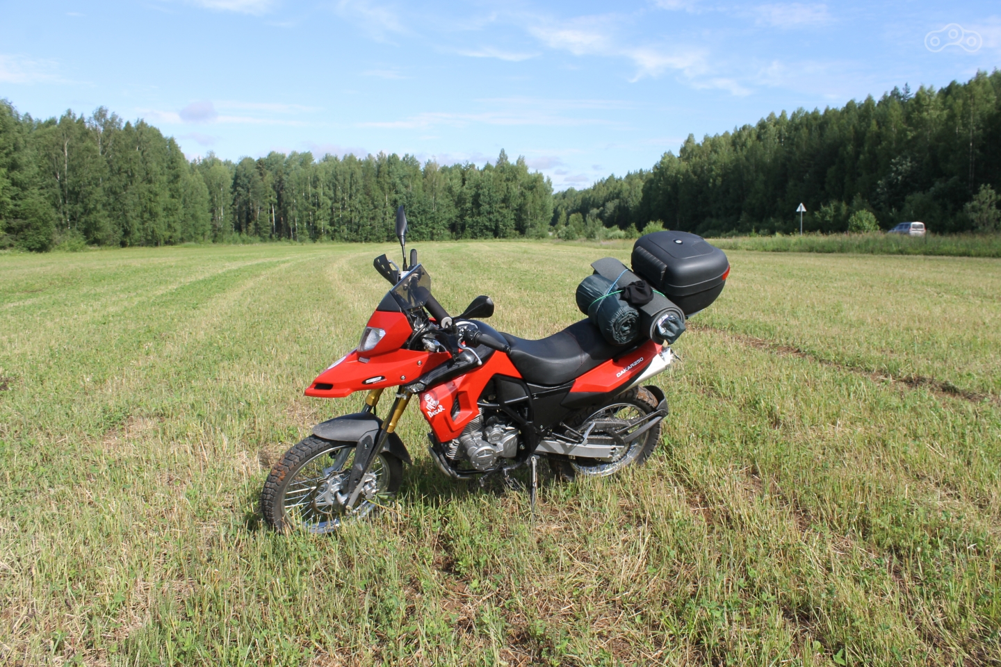 Выехал в четверг, 5 часов занял путь до Сыктывкара. По пути оборвало тросик спидометра и дальнейшую скорость я определял положением ручки газа. там я ночевал и в пять утра стартовал в Киров. Погода радовала, солнце, тепло и сухо. Нужно заметить, что на этом китайце подвески просто нет. Проехав около 150км моя пятая точка уже окаменела и я просто ехал стоя. Когда сустав на правом запястье адско болел от вибрации, Я сорвал веточку и заклинил ей ручку газа чтоб отпустить руль. Без рук проехал около 100км просто наклоняя мот в поворотах.