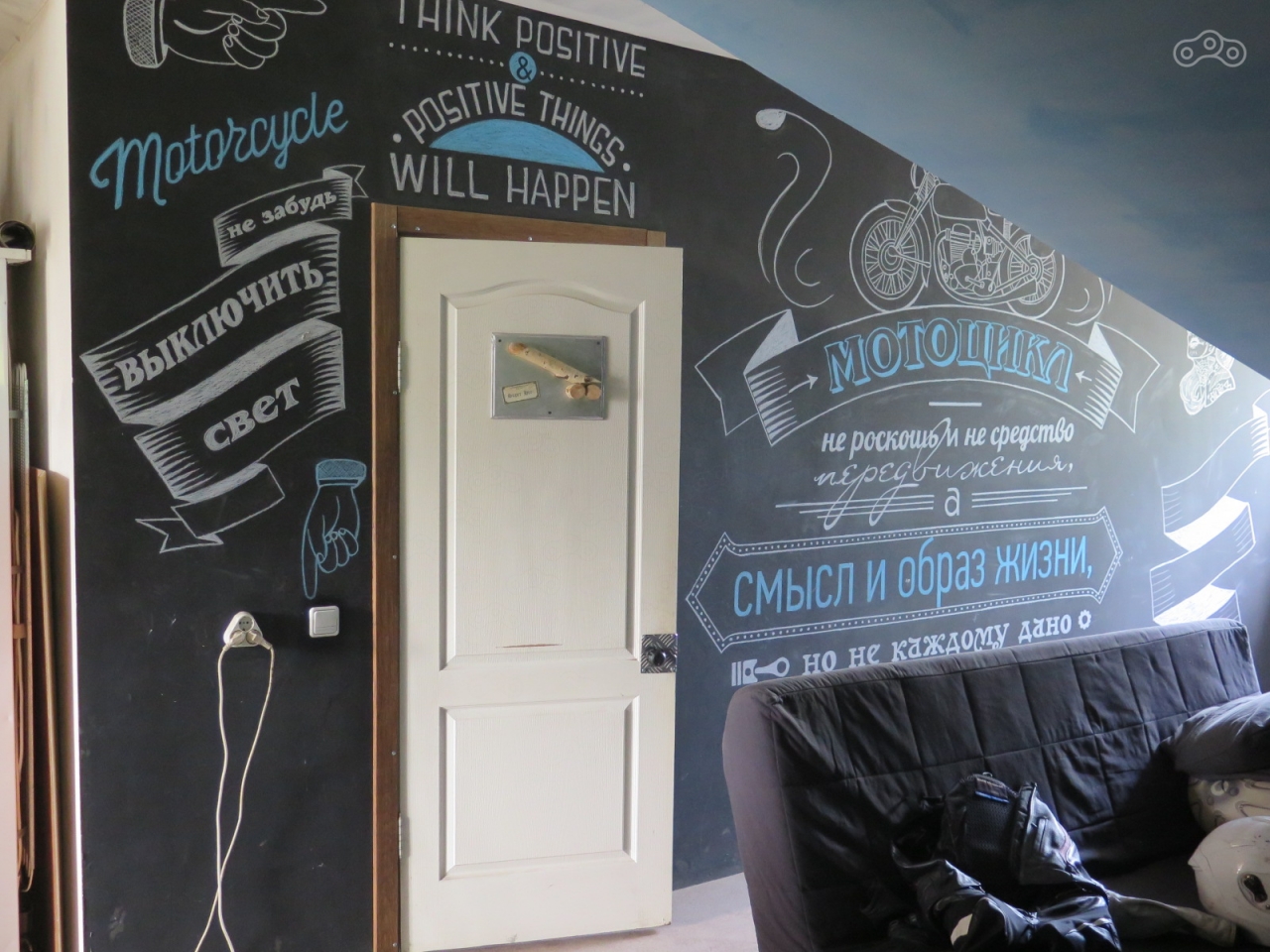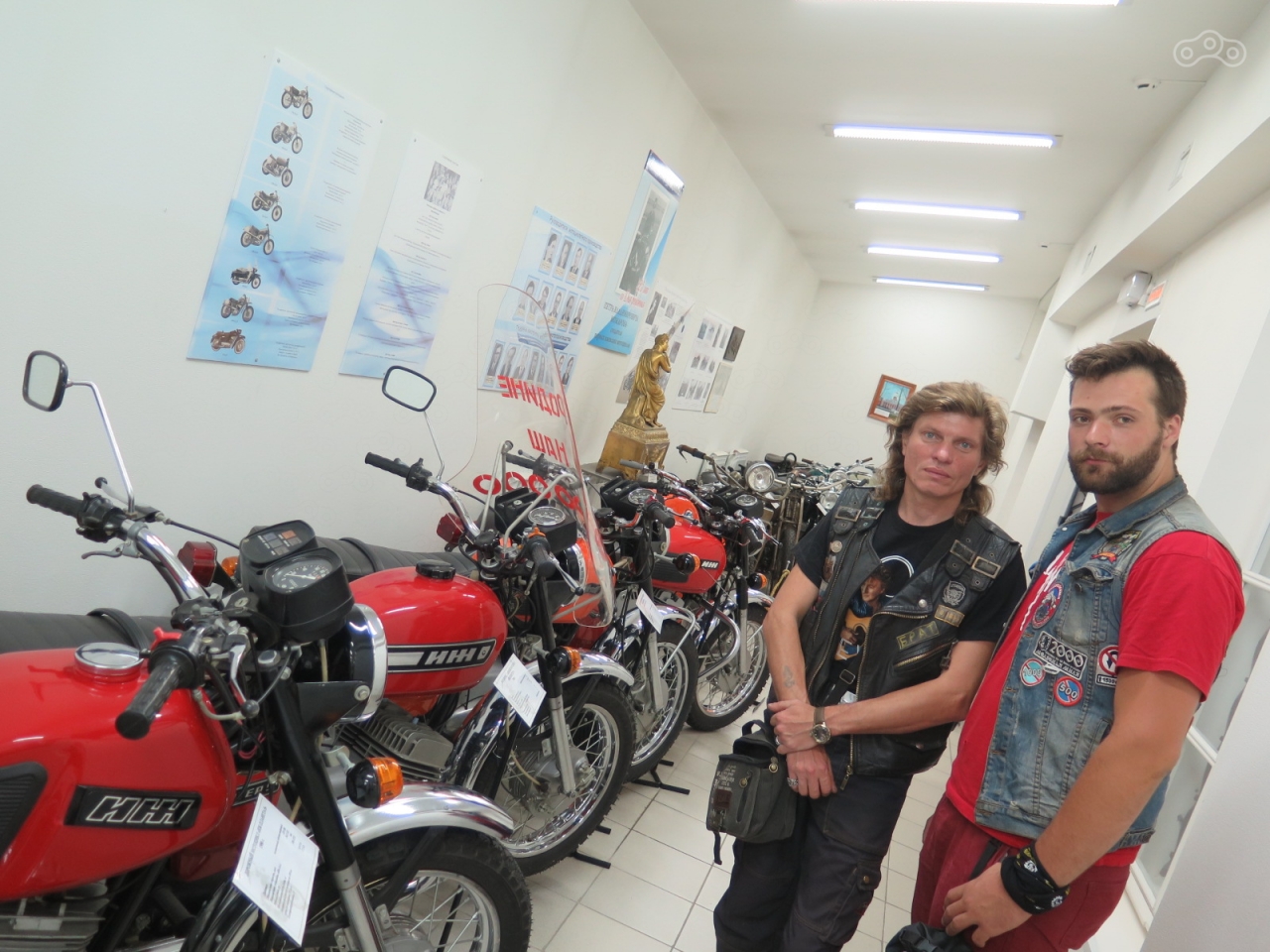 Игорь - большой энтузиаст мотодвижения и фанат ижевских мотоциклов принял нас как родных, пустил в свой гараж - настоящий осколок давно ушедшей эпохи, с фотографиями на стенах, советскими мотоциклами и знаменами на стенах. Среди этого антуража так и хочется забыть какой сейчас год и приняться за начесывание хаера, вечером же Сектор Газа выступает!