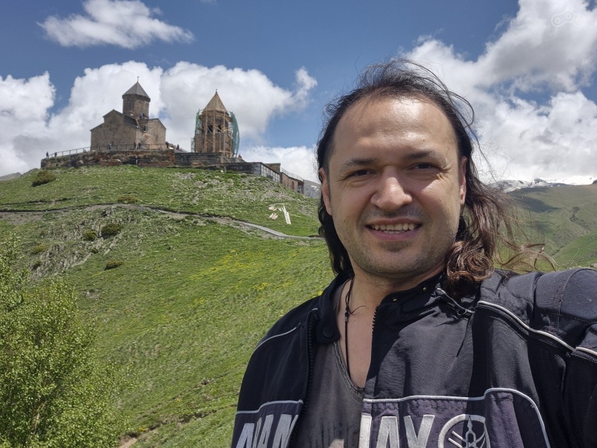 Троицкая церковь в окрестностях Степанцминды была обязательна к посещению, очень живописное место и не далеко от дороги. Посещение её так же не обошлось без происшествия, уже второй товарищ оставил свой дорогущий шлем с Sena и пошел фотографироваться, но дунул ветер и шлем улетел с обрыва. Поэтому дальше мы уже ехали без связи, так как Sena осталась только у меня.