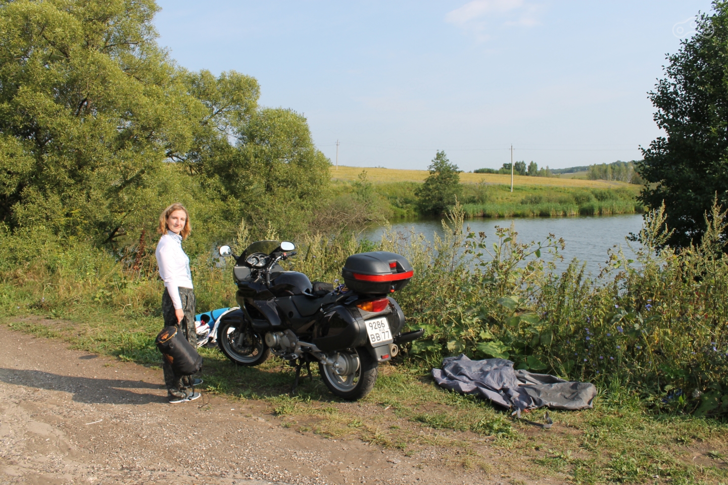 Ночью рулить не очень комфортно, тем более, когда мотоцикл из 240 кг без учета водителя превращается в +100 кг (от пассажирки в экипе, кофров с вещами, едой и водой), парусность и никакой эргономики. Поэтому, въехав в Тульскую область в районе четырех утра, мы свернули на понравившуюся нам дорожку, отъехали от трассы метров 300-400 и разложили палатку, чтобы вздремнуть пару-тройку часов.