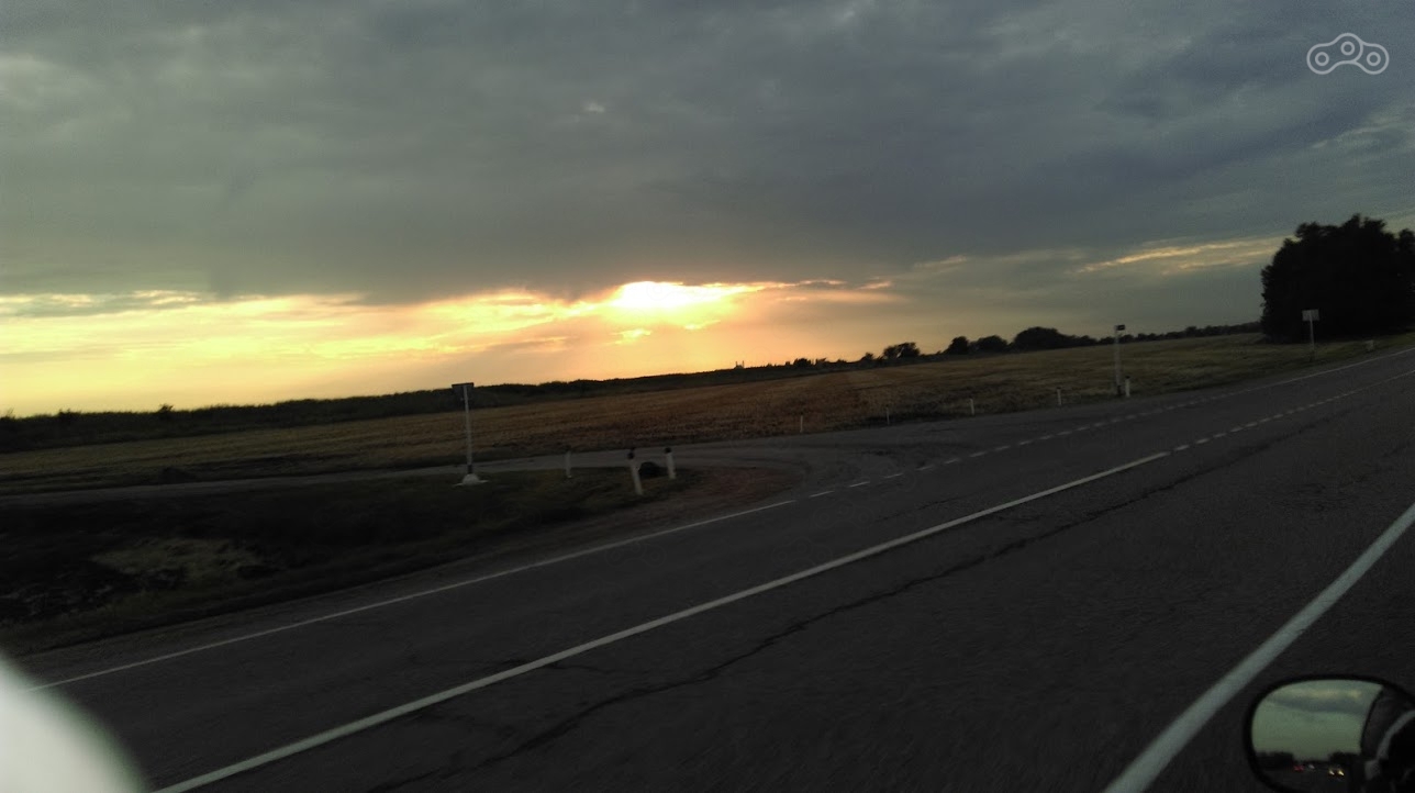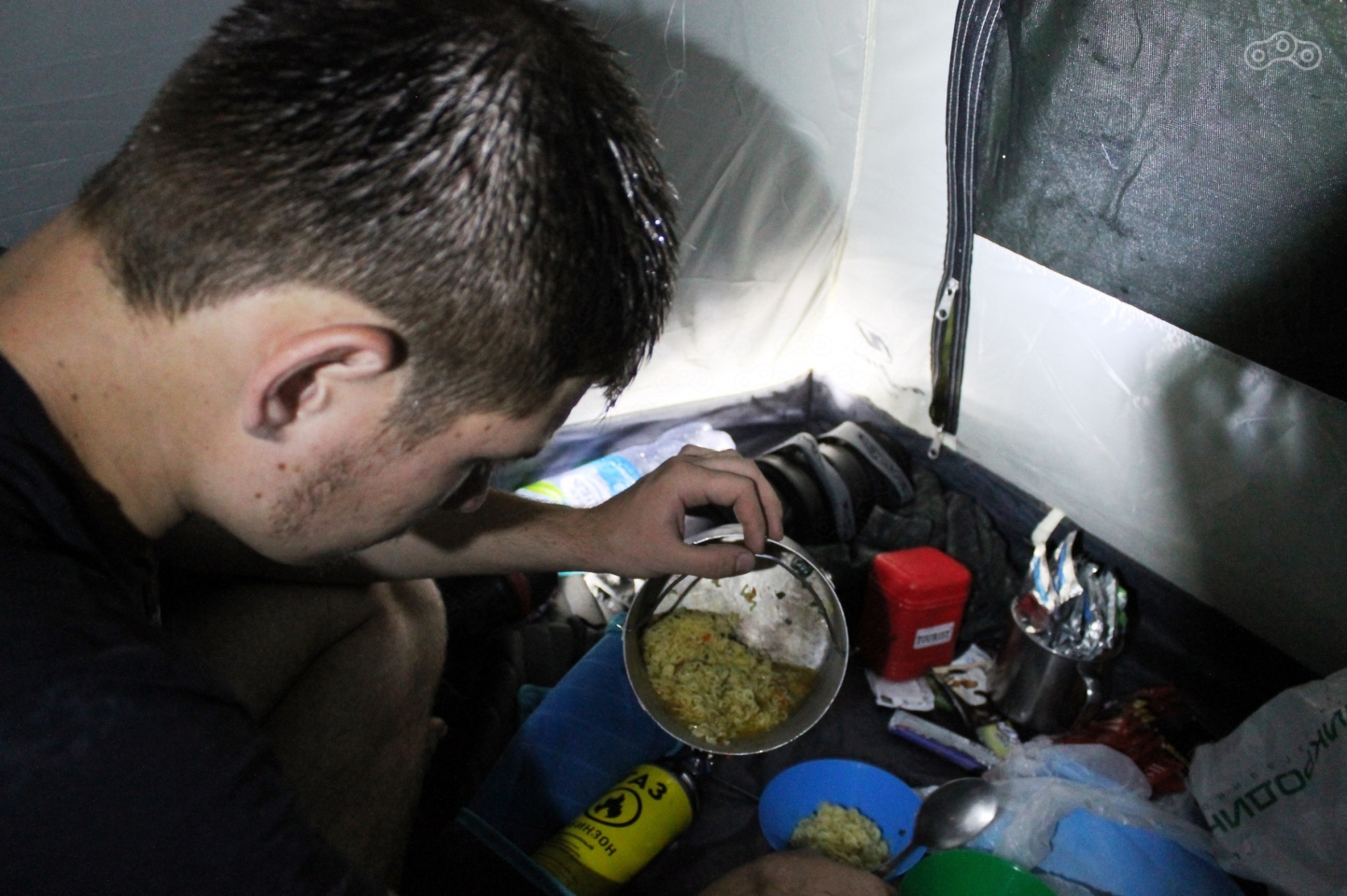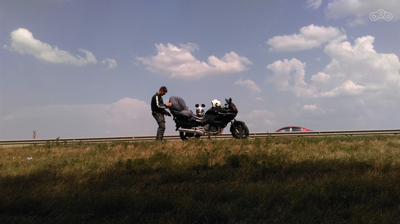 Солнце потихоньку начинало притягиваться к горизонту на западе, а впереди блестели то там, то тут красивейшие огромные молнии. Такая картина и завораживала, и пугала одновременно. Вокруг поля, где ближайший населенный пункт, не понятно. Ни кафе, ни гостиниц. Палатку ставили немного в стороне от трассы (не могу я спать под шум проносящихся по ней фур), посреди недавно убранного поля пшеницы или чего-то такого в ямке подальше от деревьев под начинающийся дождь, который с силой падал на нас крупными каплями. Еще возникла небольшая проблема, где и как поставить мотоцикл. На дороге не хотелось оставлять, поле – плодородный чернозем, мягкий и рыхлый, даже центральная подножка на мотоцикле под ним проваливалась в землю. Еще несколько попыток вдвоем поставить мотоцикл, чтобы он никуда не заваливался, и вот мы уже в палатке греем воду на газовой горелке, чтобы приготовить себе ужин.