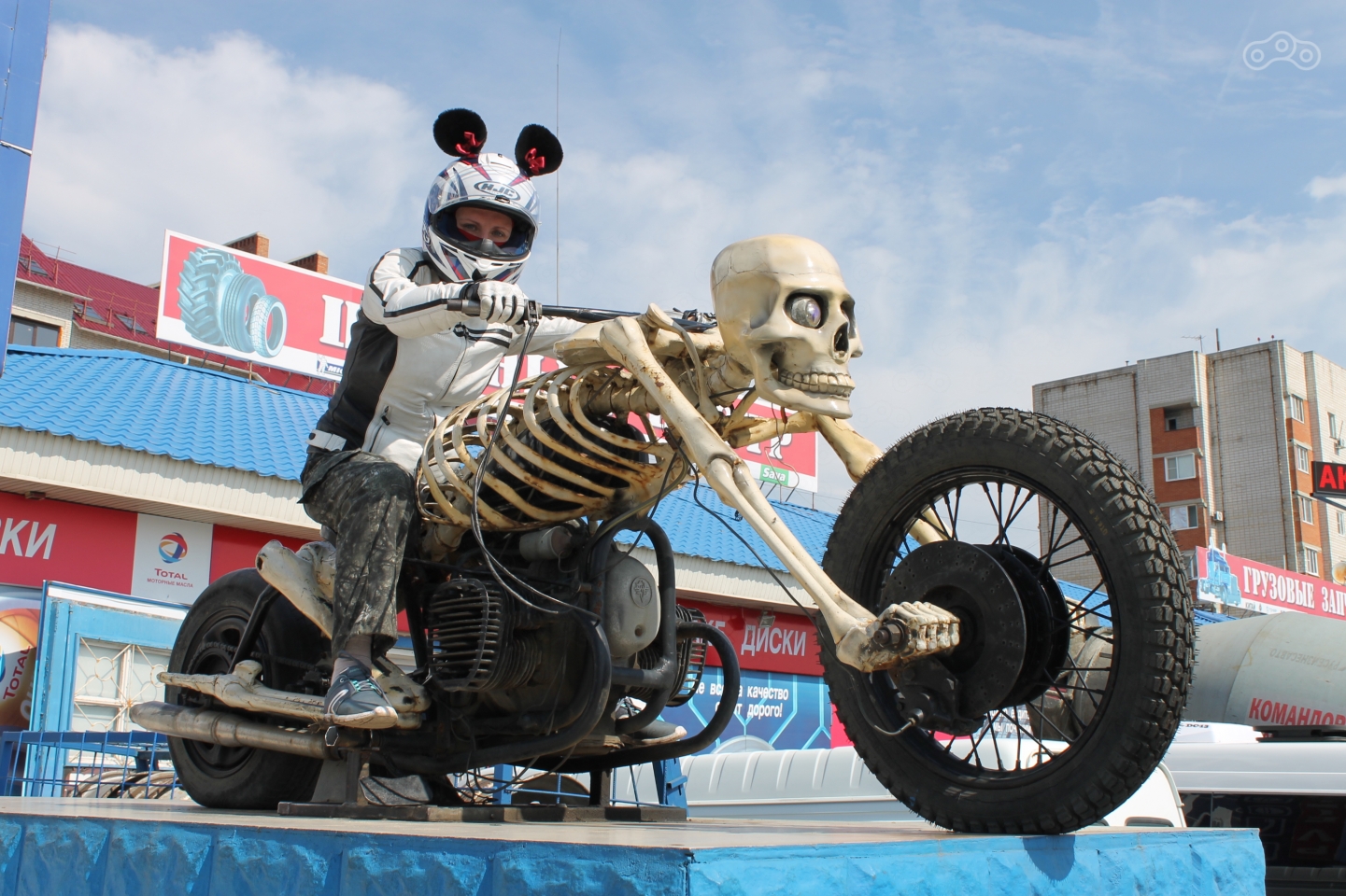 В Марьевке (это тот самый ближайший населенный пункт), до которого мы доехали и правда коротким маршрутом, нежели от него накануне до Кояшского озера, мы остановились около магазина, чтобы восполнить запасы воды и выпить холодного кваса. Там мы познакомились с местным байкером на кастомизированнном ёбрике (ну ладно, я немного преувеличила, но допэлементов на нем много было). Обсудили с ним технические вопросы по ремонту мотоциклов, уточнили кратчайший путь до трассы и помчались дальше.
