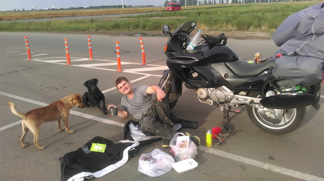 В Краснодаре мы заехали в «Магнит», чтобы покушать горячей еды. Пока грели себе чай, к нам пришли местные собаки. Мы не смогли устоять этим очаровашкам и поделились с ними нашей едой.