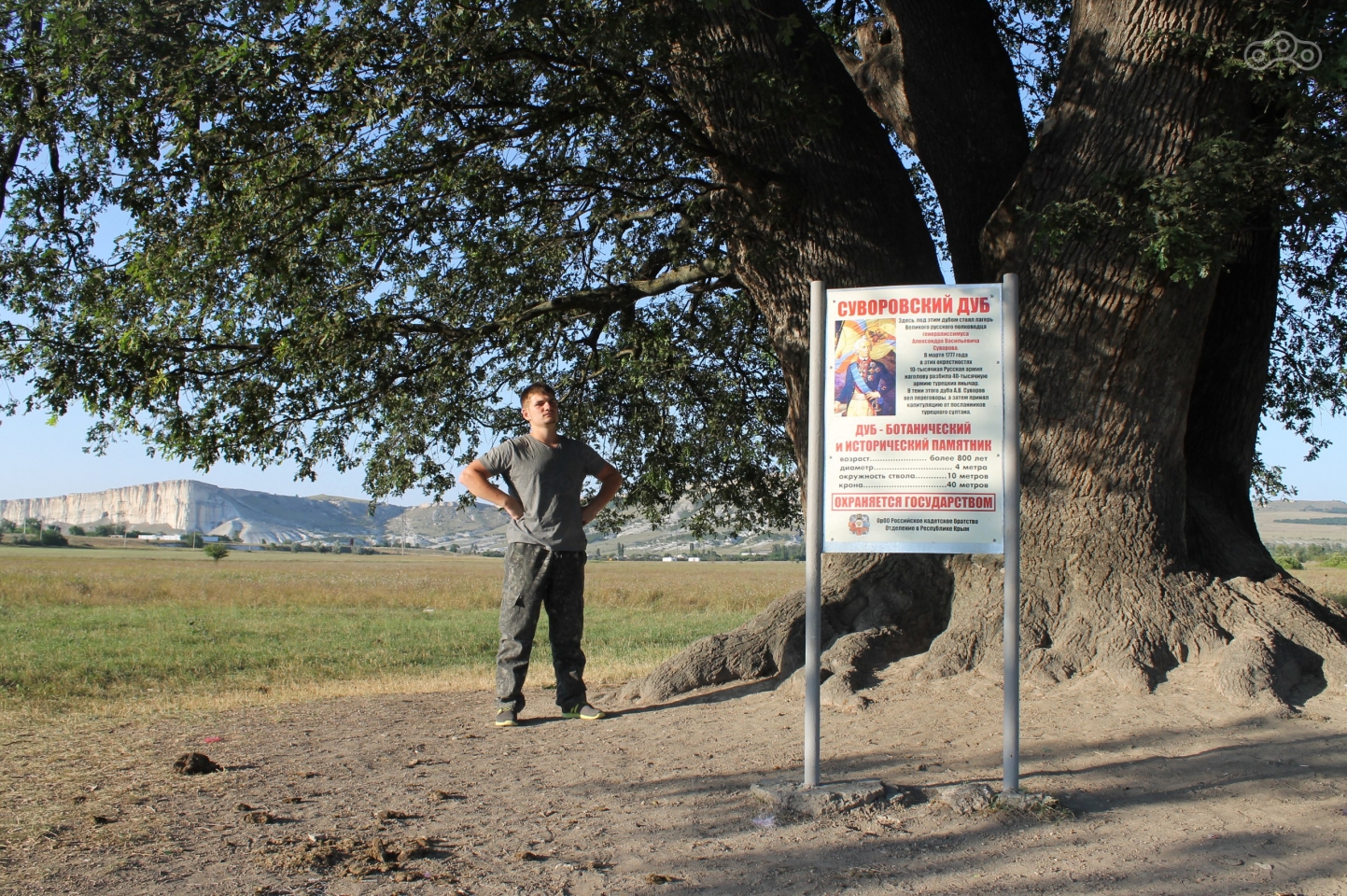 Неподалеку от скалы есть огромный 800-летний дуб. Называют его Суворовским. А все потому, что по легенде именно сюда явился посланник из турецкого лагеря, а великий полководец ждал его. Зная, что у русских всего 10 тысяч войска против 40 тысяч янычар, турецкий посланник вытащил из кармана горсть семян мака, раскрыл ладонь и гордо заявил, что как Суворову не сосчитать всех маковых зёрен, так не победить ему турецкую армию. Прославленный полководец на эти слова вынул из кармана стручок красного перца, заложил его между указательным и средним пальцами и в таком виде показал: «Накось, выкуси!». Посланник, вернувшись в турецкую ставку, уверил всех, что бояться русских ввиду их малочисленности не стоит. Поутру турки собирались дать победный бой. Однако полководец не стал медлить и, в тот же день начав военные действия, благодаря всего одному маневру окружил противника. Конница турок отступила в горы, а турецкие войска — в Кафу (нынешняя Феодосия). Царь лесов — достойное название для дерева, которое имеет ствол, чья окружность составляет почти 12, диаметр кроны около 40 м и высота 18 м.