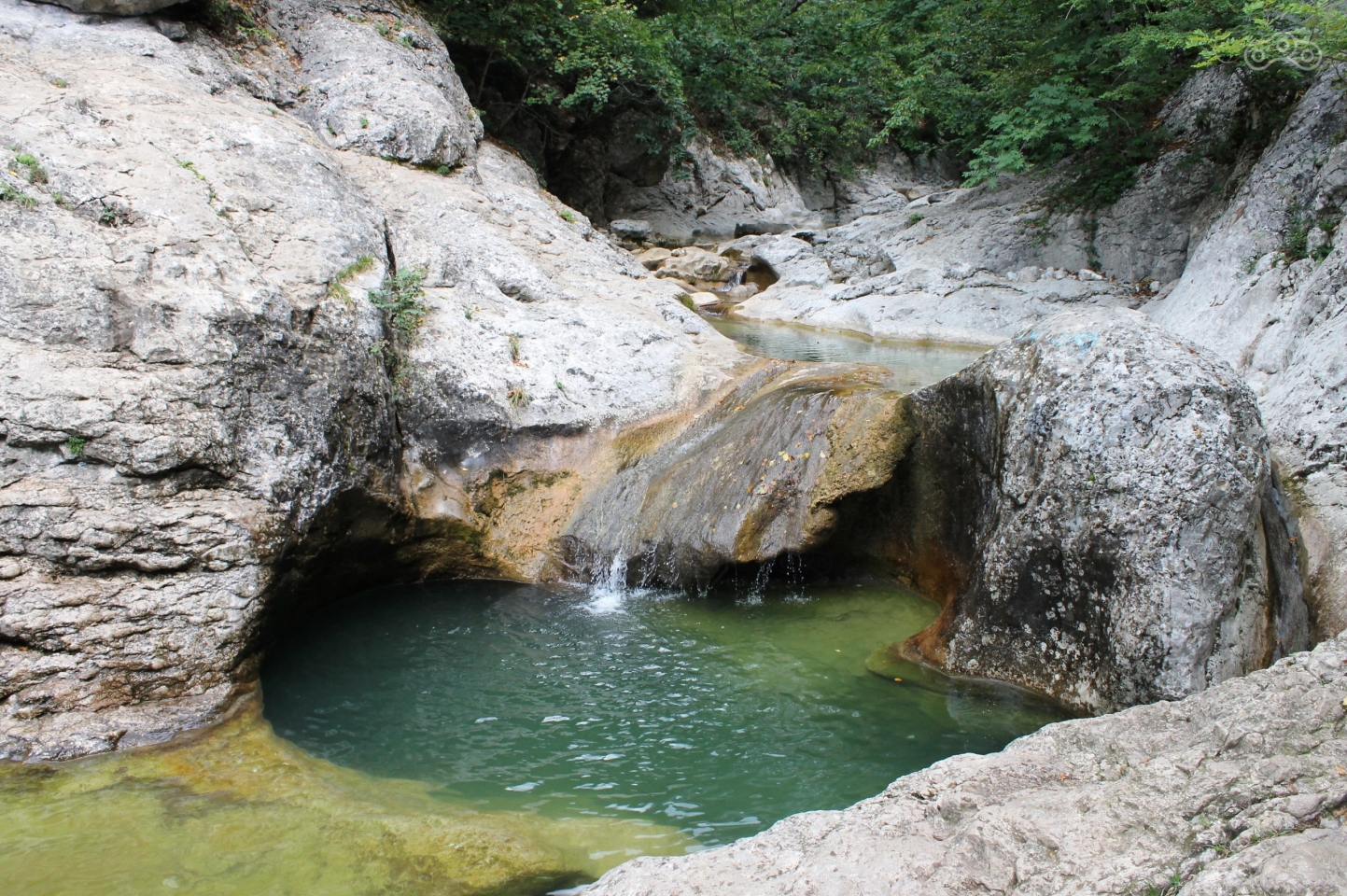 Большую остановку сделали около каньона, в начале длинного туристического маршрута (есть еще ускоренный, на 1 км короче). Вооружившись водой, купальниками и мороженкой, мы отправились в пешую прогулку. Маршрут не сложный, тропа явная, везде есть указатели, но иногда подъемы вверх заставляли меня вспомнить об отдышке. Мы спустились к Голубому озеру, вода в нем ледяная, но Фёдора это не остановило, чтобы в нем искупнуться. Брррр… Туристический маршрут ведет по красивейшему руслу реки и заканчивается «Ванной молодости», ее глубина достигает 5 м. Здесь скопление туристов, которые ждут своей очереди, чтобы искупаться и оставаться молодым и здоровым долгие годы. Мы тоже нырнули по 3 раза, как этого требует обычай.