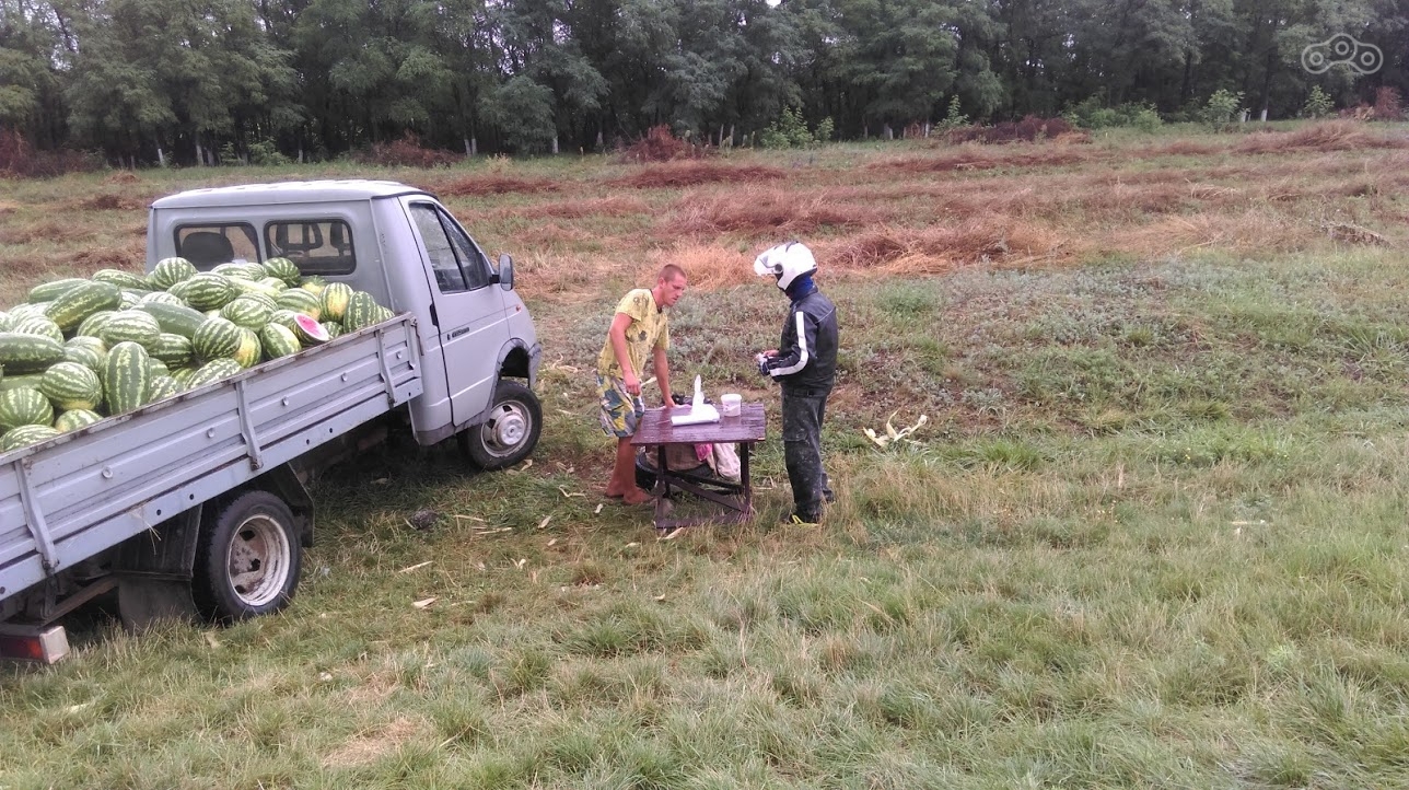 Подкрепившись, мы поехали дальше. И снова погода нам не дает расслабиться – начинает моросить дождь. Мы купили небольшую дыню и где-то в полях под деревней Крыловская остановились на ночевку. Тут нам еще пришлось поднимать наш мотоцикл. Как произошло падение, я не видела (в это время выбирала местечко поровнее, чтобы поставить палатку). Понимаю, что Фёдор должен был уже подъехать ко мне, а его все нет. Оборачиваюсь, мот лежит на боку – забуксовав в размокшей земле, он просто повалился на месте. Такое бывает, ничего страшного. Вдвоем подняли, выбрали для него потверже местечко, отужинали дынькой и легли спать под шум дождя.