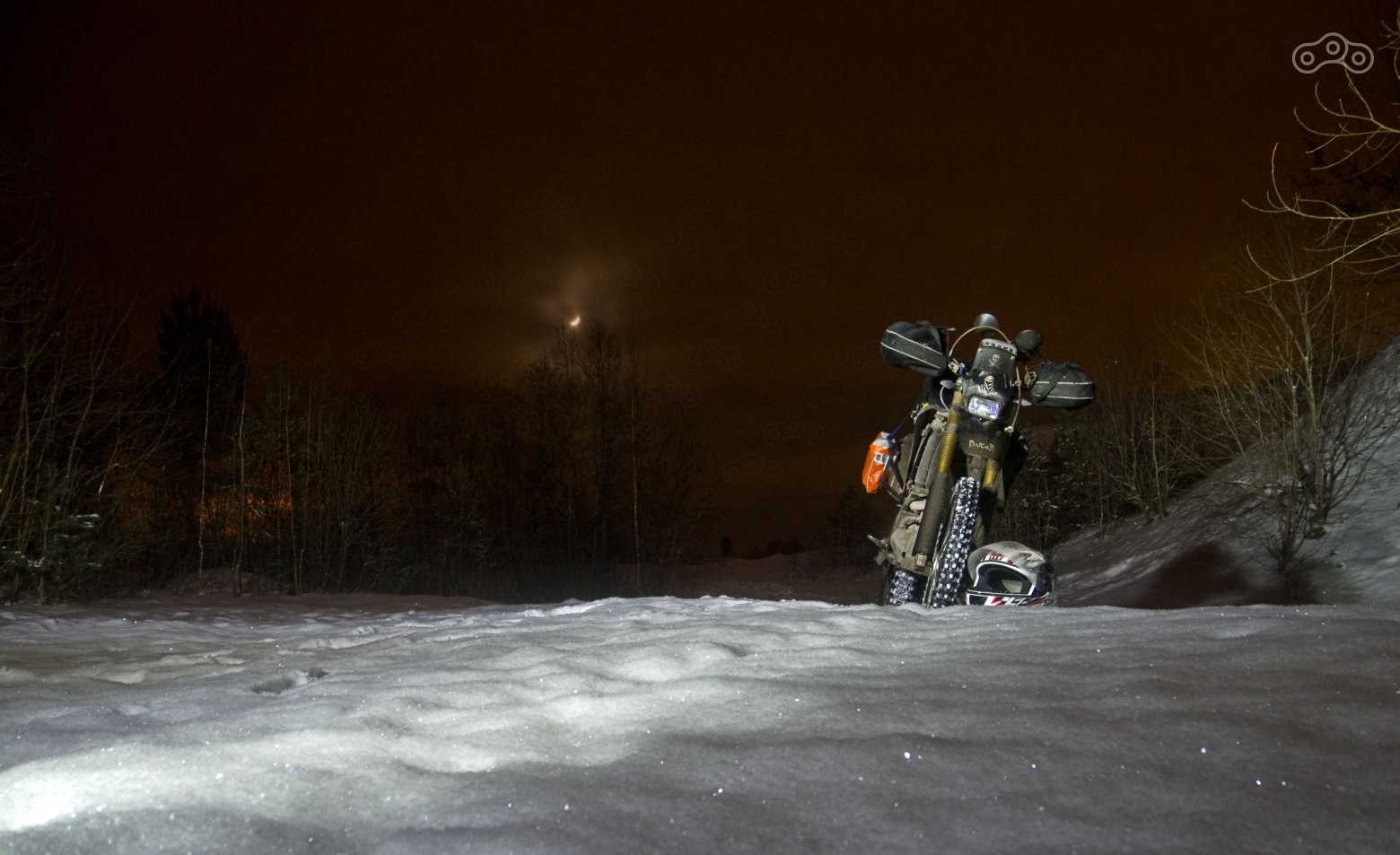 Наигравшись с фотиком, я выехал в обратную сторону. Пока я елозил по холмам с фотоаппаратом, мне удалось немного согреться и размяться, в результате обратный путь по снегу и льду оказался намного проще и быстрее. Перед выездом на трассу пришлось остановиться, чтобы протереть обмёрзший визор. Чем холоднее становилось, тем сильнее он обмерзал, т.к. я забыл в этот раз его обработать специальным составом, купленным в магазине для подводного плавания. Проблема подобных составов в том, что они действуют ограниченное количество времени, и если обработать стекло сильно заранее, то эффекта уже не будет, надо обрабатывать непосредственно перед поездкой.