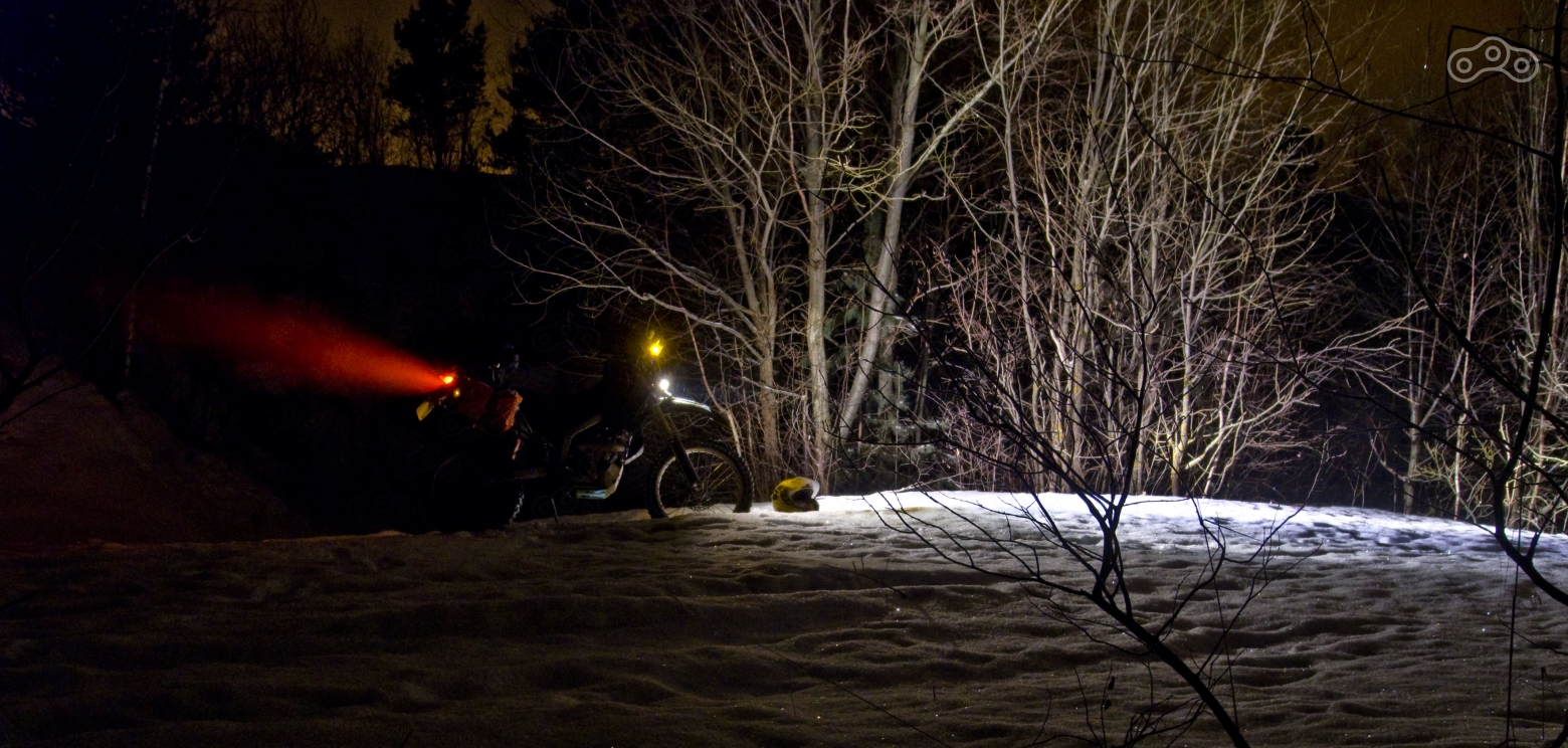 Поскольку ездить туда и обратно одним и тем же путём это довольно скучно, возле Твери я свернул на Старицкое шоссе. Причём у меня это получилось не сразу, т.к. картографические данные не отражают в себе строящуюся там сейчас эстакаду. Пришлось сделать пару кругов, прежде чем удалось найти поворот. Я думал доехать до Старицы, а потом свернуть на Ржев. Дорога там узкая и не освещена, однако транспорта в это время там практически нет, и проблем при езде особо не возникало. Правда и реагенты там тоже не льют, только убирают снег и сыпят песок (не везде), поэтому местами даже шипованная резина на скорости 40 км/ч начинала слегка «гулять». Температура медленно но верно падала. По сообщениям из интернета, в районе Рыбинска-Иваново было уже все -22°C, однако на Старицком шоссе пока что по ощущениям было не больше -10°C, что не могло не радовать. Из-за того, что визор обмерзал, мне пришлось ехать с открытым стеклом, и первое время моему лицу это не очень нравилось. Но, что интересно, через какое-то время организм адаптировался, и я вообще перестал чувствовать мороз открытой частью лица (у меня подшлемник всё кроме глаз закрывает). Так же большой проблемой, помимо обмерзания визора, было отсутствие ветрозащиты ног – я пока так и не смог ничего быстросъёмного придумать на свой мотоцикл. Поэтому периодически приходилось останавливаться в помещениях и снимать ботинки. Даже в специальных зимних тёплых влагоотводящих носках ноги всё равно немного потеют, и когда ботинки остынут, то пальцы начинают мёрзнуть. Мембранные же верхние носки лишь защищают ноги от промокания, но не греют. Но тут крылась проблема – на Старицком шоссе посреди ночи не так-то просто найти место для привала в помещении. Обычно я останавливаюсь на АЗС с кафешкой, там заказываю чай с пирожками, и пока перекусываю, скидываю мотоботы, давая просохнуть термоноскам, которые быстро высыхают прямо на ногах. Кстати, заметил интересную особенность: сколько уже всяких крутых термоносок перепробовал, у всех один и тот же прикол – они значительно лучше выполняют свои функции, если надеть их, вывернув наизнанку.