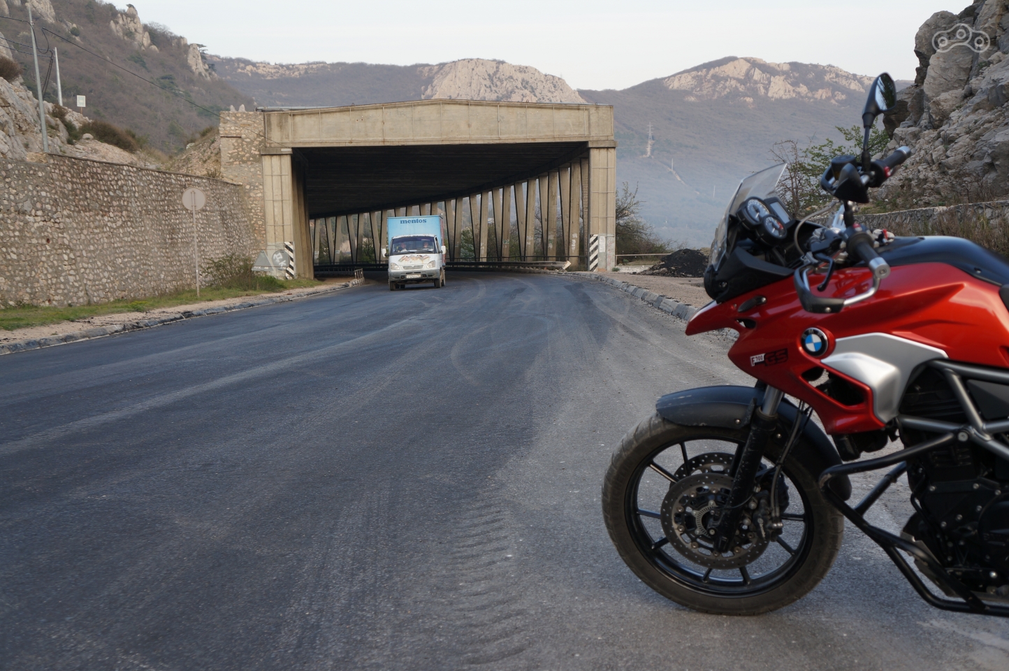 Наверху местами ещё лежал снег, но асфальт выглядел вполне сухим, да и погода становилась всё лучше, поэтому мы отправились дальше. Дорога проходила мимо внушительного вида военных радаров и, спускаясь с гор, серпантин вывел нас к Бахчисараю.