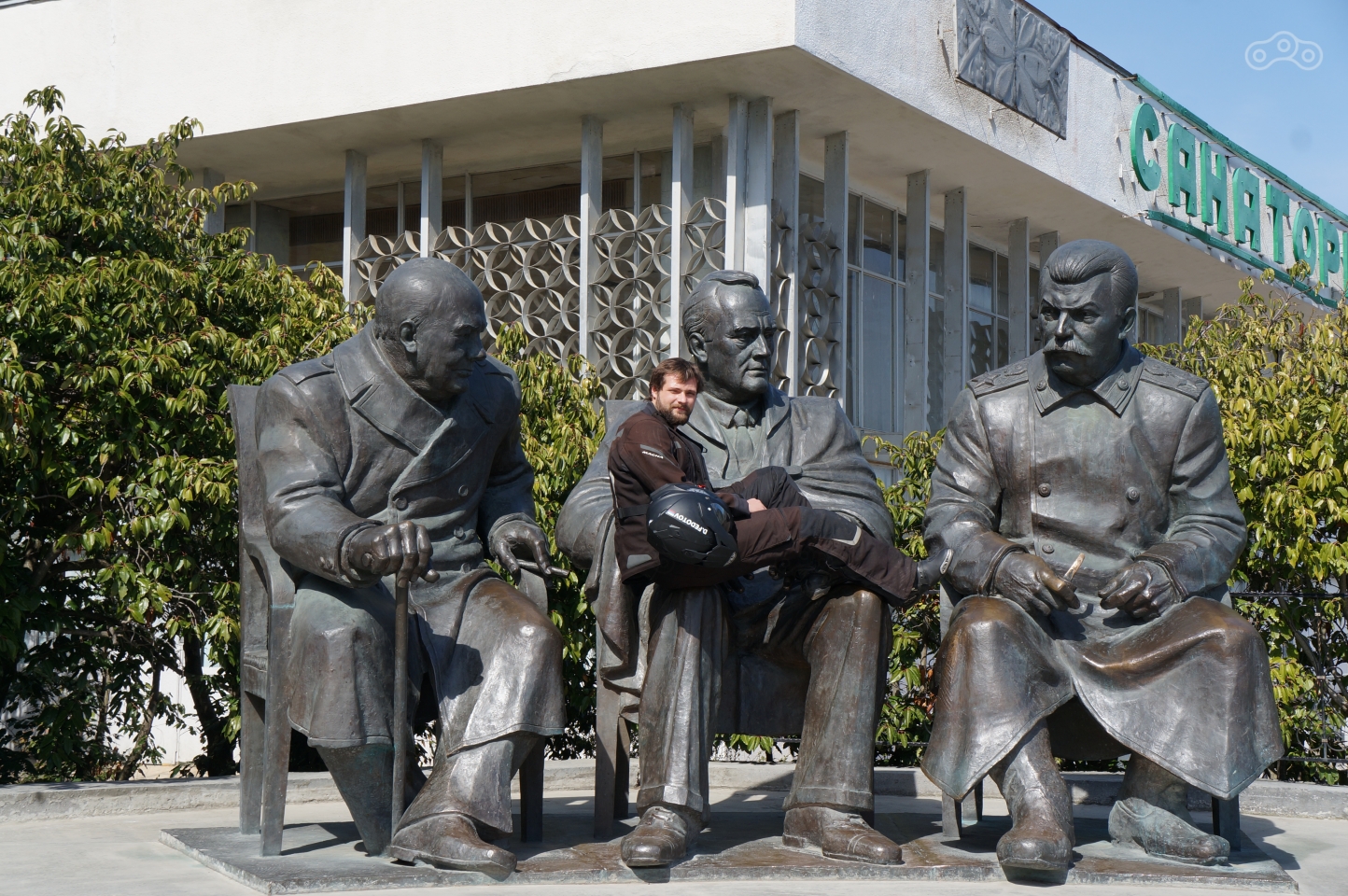 Первый день, вместо положенной нормальным ученикам площадки, для нас начался с небольшой экскурсии по Ялте – нам, ученикам, дали возможность привыкнуть к мотоциклу и вспомнить про «первую вниз», а инструктору – оценить наши навыки и убедиться, что можно ехать дальше. Стартовым чекпоинтом стал Ливадийский дворец, известный на весь мир тем, что именно он принимал гостей ялтинской конференции 1945 года, в которой участвовали Сталин, Рузвельт и Черчилль, чему посвящен целый монумент, расположенный неподалёку.