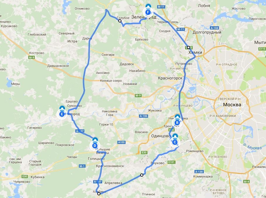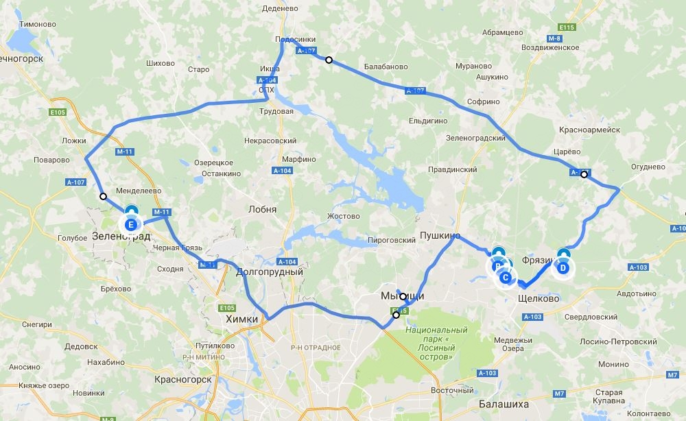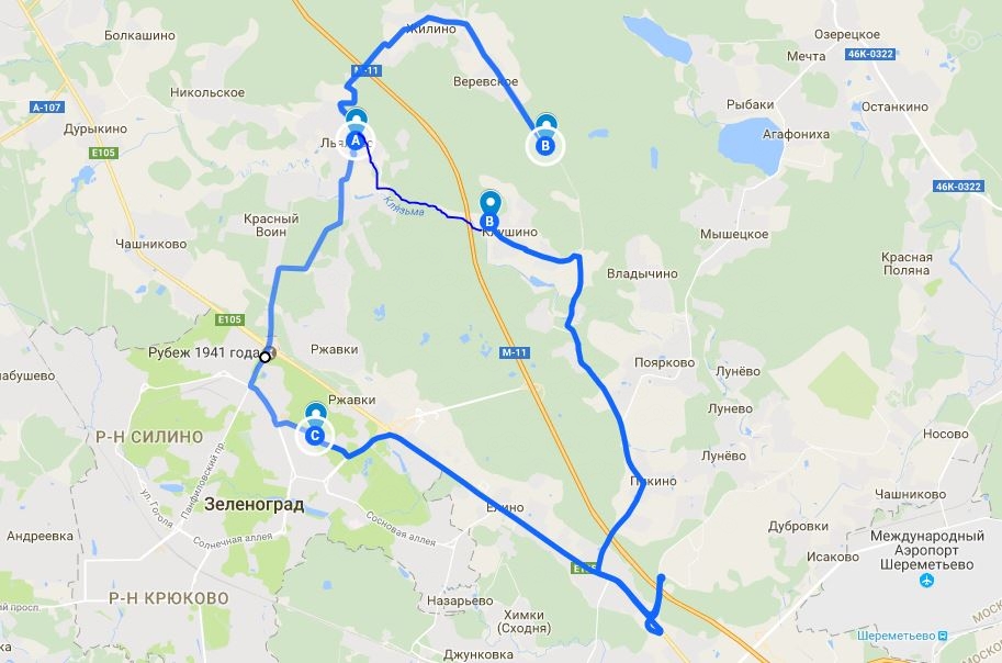 Если кто-то из читающих нашу статью вдруг окажется под Зеленоградом и решит покататься, не верьте Google, который смело прокладывает автомобильный маршрут через верхнюю на нашей карте букву "В" в южном направлении в Клушино (мы уже ранее писали про супер хай-вей в Крыму к Кояшскому озеру, к которому вместо заявленных гуглом 40 минут, мы ехали несколько долгих и жарких часов). Именно в этой точке "В" сделана предшествующая карте маршрута фотография.