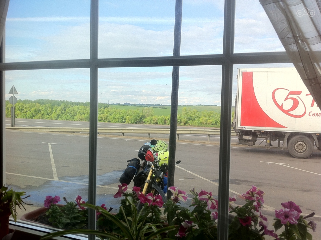 На трассу М4 я вышел в районе Богучара и сразу заехал на заправку Башнефть. Требовалась заправка во всех смыслах – нужно было заправить мотоцикл и нормально поесть. Я залил 95го и поехал к находившейся рядом кафе-гостинице, но когда выезжал от заправочного автомата, почувствовал, что меня тащит в сторону. Я понял, что зацепил боковым багажом металлический отбойник, краска от него осталась на чехлах. Это был явный признак, что пора передохнуть. Я зашёл в кафе, заказал борщ и кофе с молоком, и ужаснулся ценам. Впрочем, когда я узнал цены на ночлег (2500 рублей за одноместный номер на ночь), я понял, что надо двигать дальше. Поев и выпив кофе, я поставил на ручку газа «лепесток», позволяющий расслабить правую руку, и продолжил путь. Однако в районе Алексеево-Лозовское на посту ДПС мне помахали полосатой палочкой. Не ожидая подвоха, я остановился. Инспектор тут же достал смартфон и стал фотографировать мой госномер. Дело в том, что у меня номер весь мятый после ряда эпизодов на оффроаде, и в силу конструкции багажной системы и колхозного крепления номера, которое я конечно же немного подогнул кверху, плохо читается с расстояния уже нескольких метров. Инспектор начал мне что-то втирать про камеры и статью 12.2ч2, однако я отогнул номер вниз и усмехнулся, сказав «Какие нарушения скорости, Вы о чём? Это же чекушка одноствольная, она сотню едет в отсечку на 6-й. Никаких устройств и материалов тут нет, тем более я же уже устранил проблему.» В общем мы побеседовали, выписали мне 500 рублей по 12.2ч1, и я укатил дальше с подпорченным настроением. Уже начало вечереть, я стал подумывать о поиске места для ночлега.