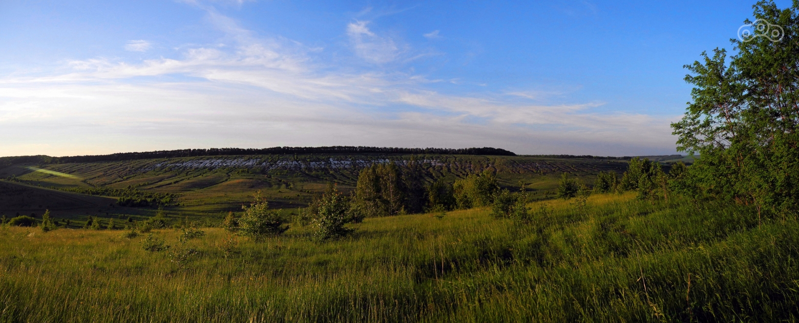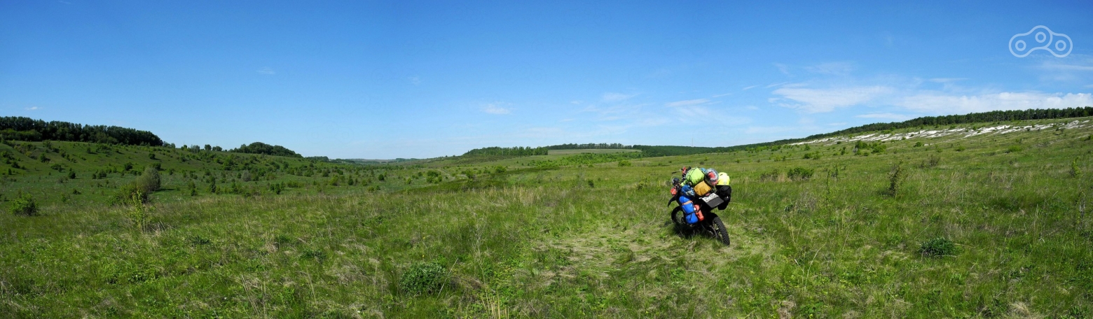 Солнце клонилось к закату, когда недалеко от деревни Новоуколово я увидел живописный овраг, обрамлённый известняковыми холмами, где и решил остановиться на ночь. И естественно я не мог спуститься как все нормальные люди по накатанной грунтовке, вместо этого залез по фрирайду в траву по бак. ))) Я немного покатался по холмам, удивляясь ровным параллельным бороздам, проходившим вдоль холмов на расстоянии нескольких метров друг от друга. Сам овраг выглядел так, как будто очень давно тут протекала река. Я уж не знаю, люди ли её осушили или это естественная засуха, признаки которой я замечаю во многих регионах. Пока катался, первый раз за поездку уронил мотоцикл, а поднимая его, понял, что ЦТ всё же слишком высоко, надо в следующий раз как-то иначе багаж располагать.