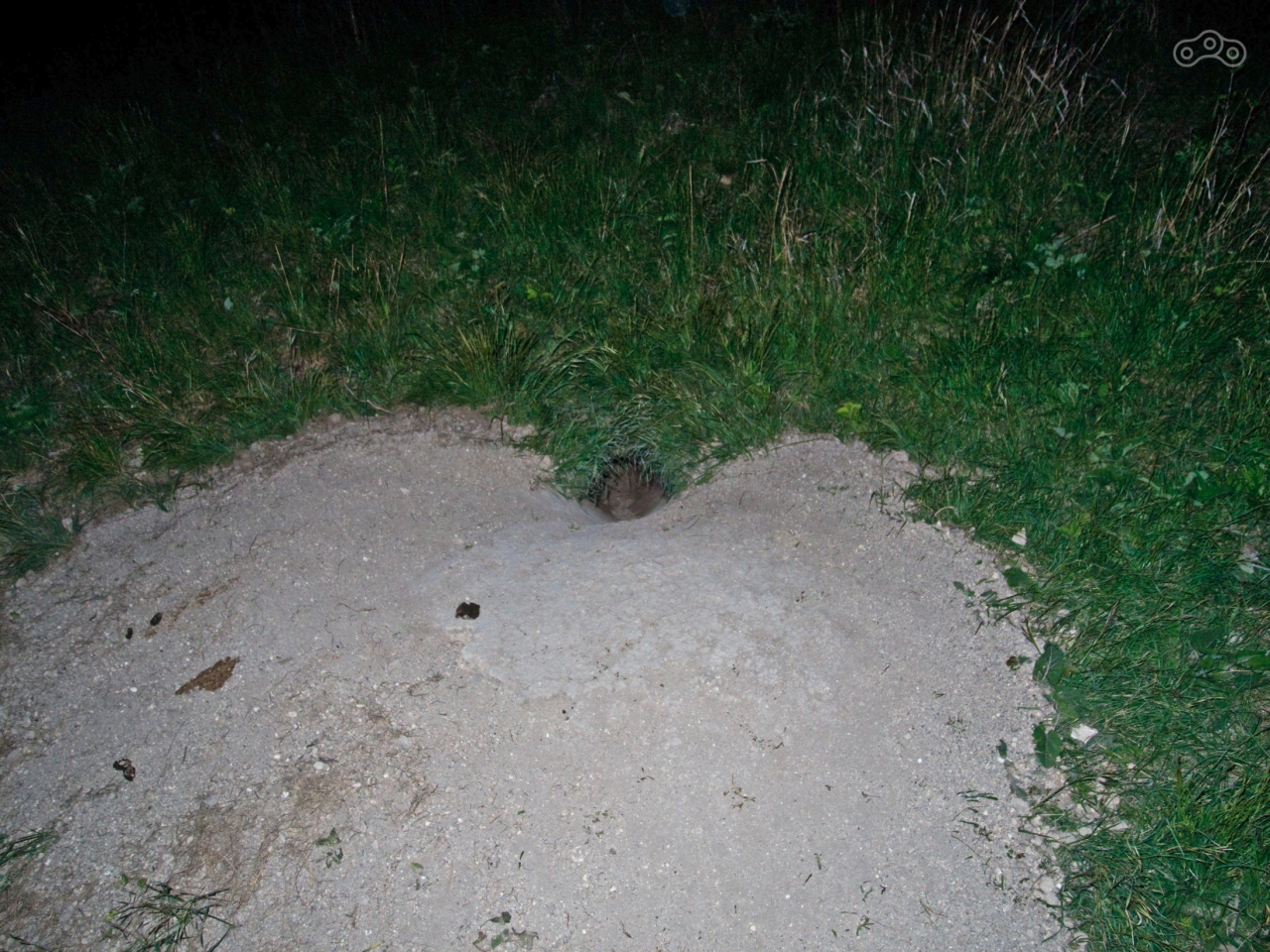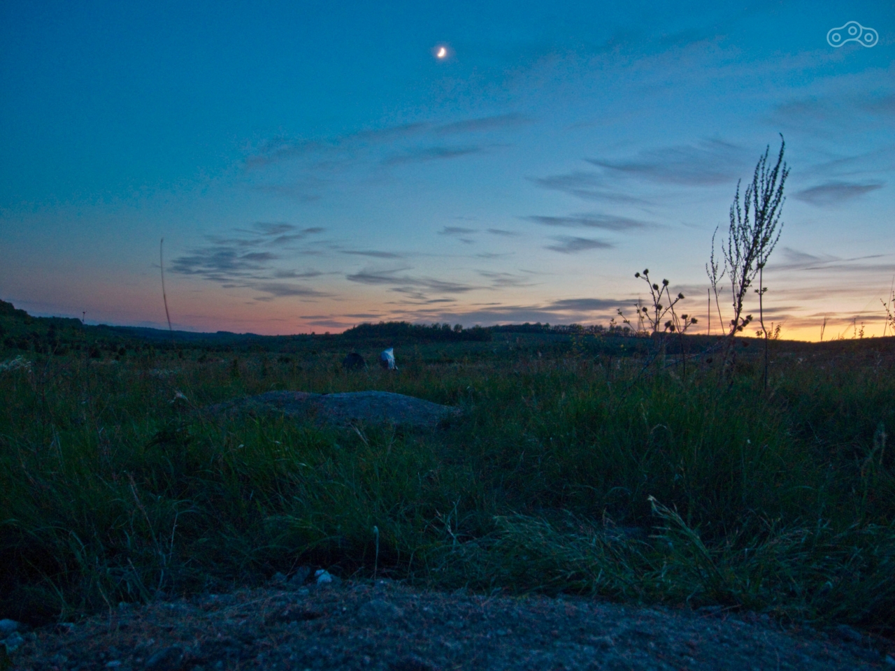 Уже смеркалось, когда я наконец развернул лагерь. Буквально в 20 метрах от палатки я увидел земляные холмики и решил сделать вечернее фото с одного из них, т.к. для вечерней фотографии нужна поверхность, куда можно поставить фотоаппарат на длинной выдержке. Когда я подошёл к одному из холмиков, я внезапно обнаружил, что это не просто холмики, а входы в чьи-то дома – огромные, с мою голову, норы. Из одной из нор раздался скрипящий звук, я понял, что хозяева дома и решил не подходить ближе. Однако пару кадров всё же успел заснять. В овраге дул лёгкий тёплый ветерок, благодаря этому было совсем немного комаров. И снова практически не было связи. Лишь изредка появлялись 1-2 палки и буква Е на экране, что позволяло писать сообщения в Telegram. Больше ничего не грузилось, пришлось помучать Юру на тему грядущих погодных условий.