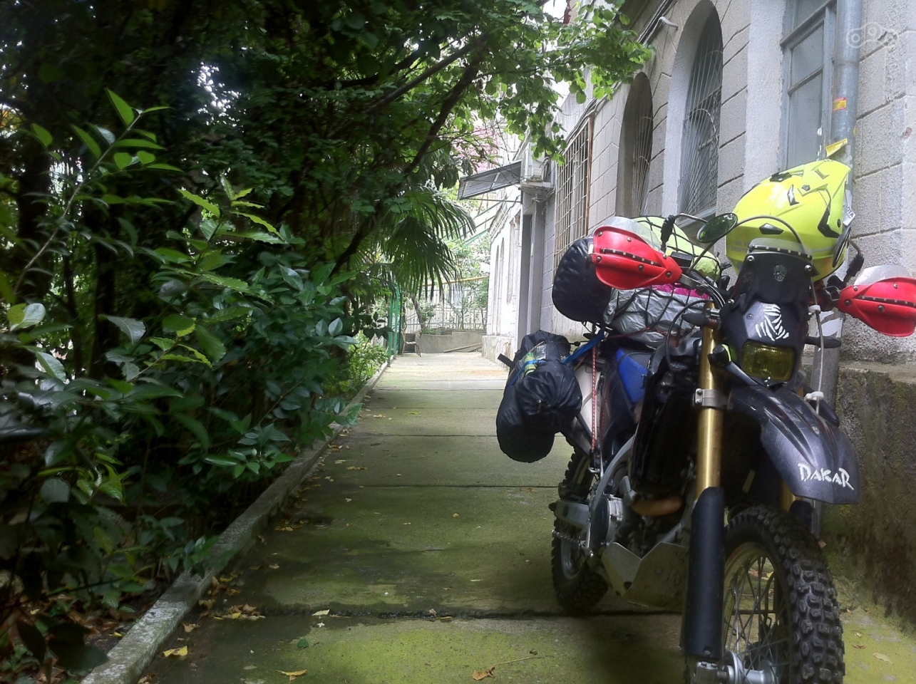 Когда я наконец добрался до центра Сочи, который, кстати, является самым длинным городом в мире, мы созвонились с местным известным байкером, чтобы он подсказал, где можно безопасно поставить мотоцикл. Однако он сказал, что свой байк бросает прямо на улице, и вообще мотоциклы тут никто не трогает. Учитывая, что место курортное и там полно отдыхающих из разных регионов, а также небольшой вес моего мотоцикла, я не был так уверен в его безопасности. Поэтому мы с Серёгой попытались затолкать его по небольшой лесенке на площадку перед крыльцом. Однако с багажом это оказалось не так просто даже вдвоём. Заехать же не получилось бы из-за 90-градусного поворота лестницы и полного отсутствия места для разгона перед вторым пролётом. Очень кстати на улице стоял дядька кавказской наружности и трепался по телефону. Он предложил свою помощь, и мы втроём легко затолкали мот на площадку прямо под окна, где я, разгрузив часть багажа, накрыл его чехлом. Теперь можно было спать более спокойно.