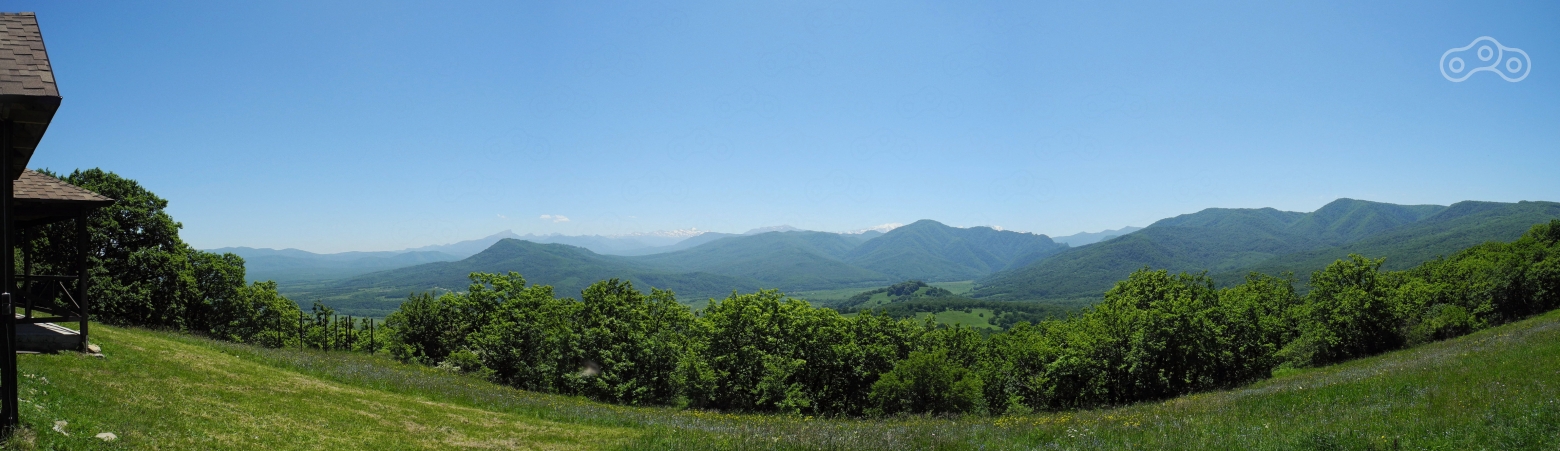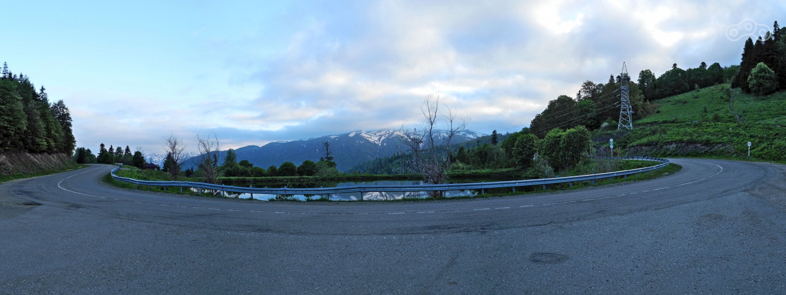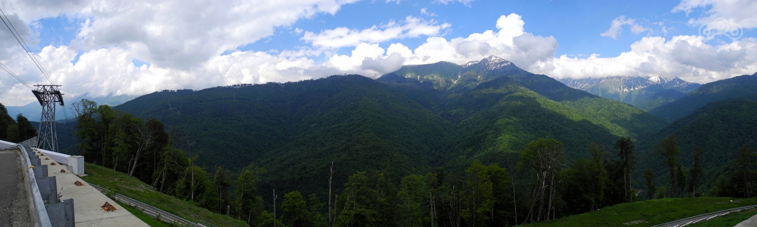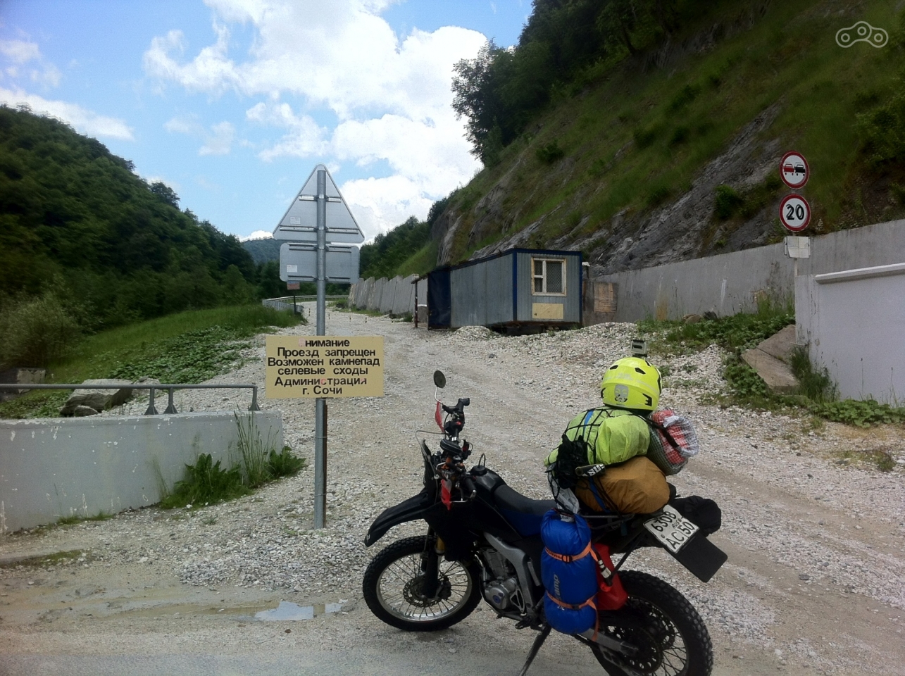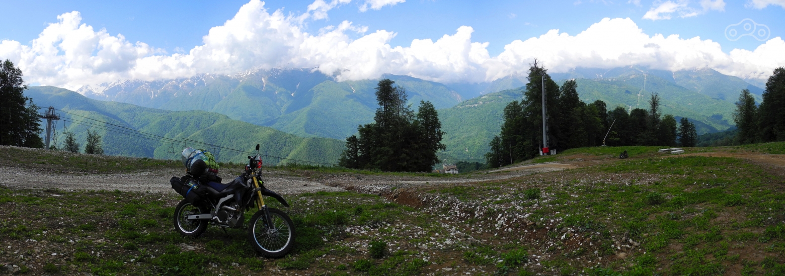 Красная Поляна и Роза Хутор вызвали противоречивые чувства. С одной стороны убивающие на повал своей красотой горные пейзажи захватывали дух, а с другой элитная и дорогая даже с виду инфраструктура, больше напоминающая какую-нибудь Швейцарию, несколько напрягала своей напыщеностью и недоступностью. А пафос и понты отдыхающих были хорошо знакомы по Москве, тут их меньше всего хотелось встретить. Я доехал до самого конца дороги в Роза Хутор в расчёте подняться на гору, но подъём по грунтовке был закрыт по распоряжению администрации г.Сочи из-за селей и обвалов, дорога была перекрыта и охранялась. Пока я размышлял, попинывая мусор под ногами, как же мне забраться на гору, к КПП подкатил квадрик, и охранник его пропустил. Я удивился и подошёл к нему с вопросом «А что, так можно было?», однако охранник сказал, что это был не турист, а мне, если я хочу подняться на гору, стоит либо воспользоваться подъёмником, либо подняться по серпантину до Олимпийской Деревни, повернув на перекрёстке возле водного колеса. Так я и поступил. Где-то на середине подъёма я подъехал к проходной и спросил у охранника, куда здесь вообще можно подняться своим ходом. Мы обсудили предстоящие мне маршруты. Охранник оказался родом из Адыгеи и бывшим водителем-дальнобойщиком. Он предупредил, что в КЧР/КБР гаишники хапуги и любят вымогать деньги, поэтому лучше не светить наличность и держать на готове пару сотен рублей. Также он предупредил, что навигатор в тех местах врёт. Среди прочего я спросил, можно ли подняться на хребет напротив, где явно виднелся какой-то комплекс зданий, однако он ответил, что лучше забыть об этом – это секретная дача президента РФ, дороги туда нет, а леса напичканы ФСОшниками, и штраф, если поймают, порядка 5000 рублей. Я решил не проверять, на сколько это басни или правда, а вместо этого доехал до Олимпийской деревни, где захотел сделал пару кадров со смотровой площадки. Пришлось несколько минут подождать, пока гламурные чики перестанут кривляться перед камерой мобилки, отклячивая свои фитоняшные задницы и силиконовые губы. Но они похоже прекращать не собирались, пришлось попросить их покинуть кадр прямым текстом. Рядом сидели какие-то ребята и завтракали. Я сначала подумал, что это местные, но оказалось тоже туристы, просто уже хорошо знакомые с местностью. Они подтвердили мне информацию о секретной даче и, рассказав немного деталей о дороге от Туапсе до Майкопа, пожелали удачи в пути.