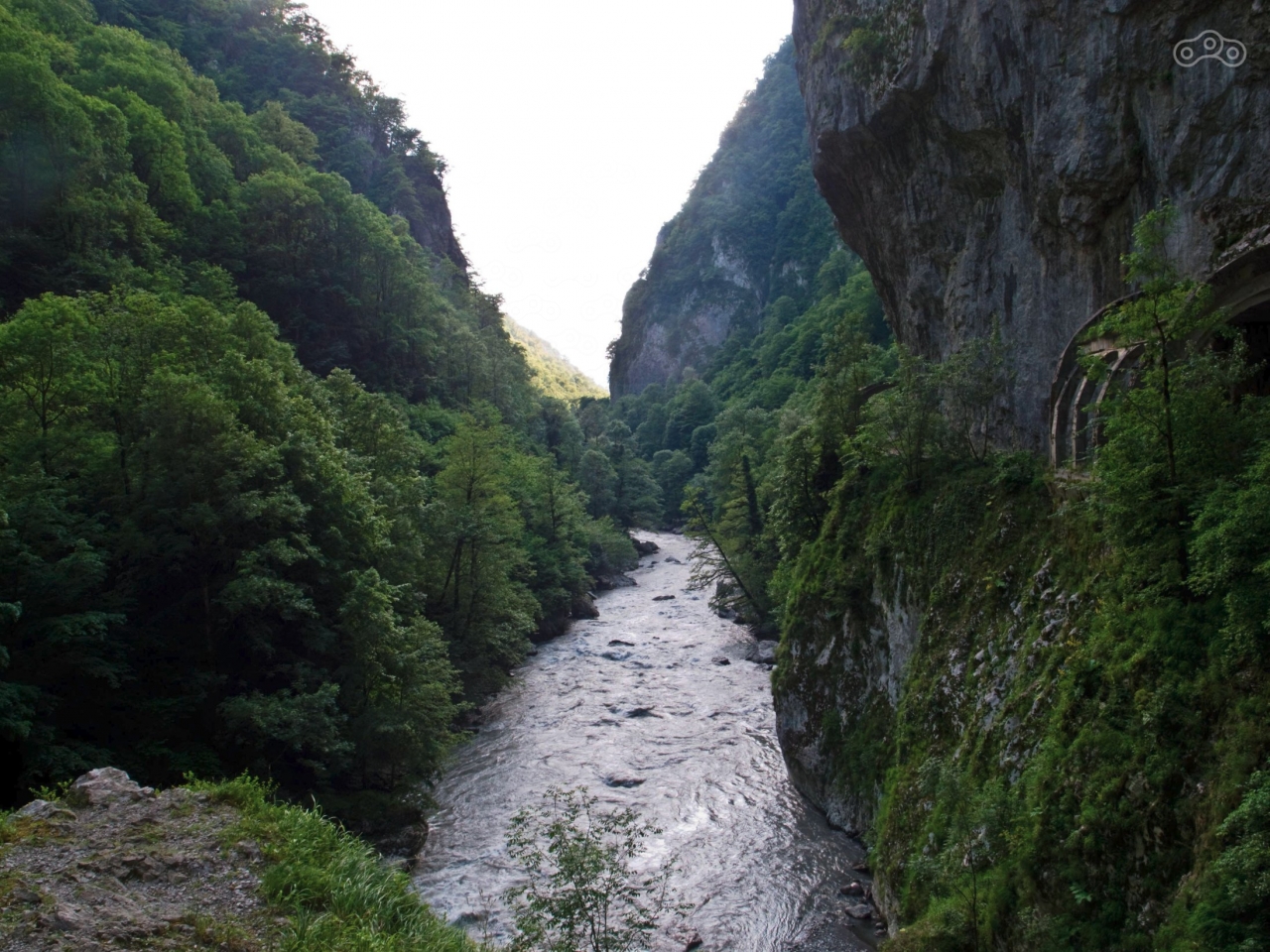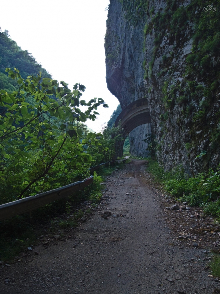 Следующим пунктом программы путешествия была поездка на Красную Поляну. Причём меня интересовала не столько сама Красная Поляна, сколько кусок старой заброшенной дороги, проходящей по краю ущелья, который я видел в видеоблоге Володи Аристархова. На выезде из города проезд по правой стороне реки Мзымта был закрыт в связи с проведением шоссейной велогонки, поэтому всех отправляли на левую сторону. Это было даже хорошо, потому что я даже приблизительно не представлял, где эта старая дорога находится. Проехав немного, я списался в ВК с Аделем, который проинструктировал меня, где находится эта дорога. Оказалось, что я ехал по правильному берегу. Через какое-то время я увидел перед туннелем съезд, закрытый пластиковым отбойником. Естественно меня это не остановило, и я аккуратно пополз по старой дороге, местами усыпанной камнями от обвалов, а местами обвалившейся в реку. Дорога выглядела таинственно и привлекательно. Под одной из арок стоял скутер, а рядом был обрыв. Я остановился и посмотрел с обрыва вниз, вдруг владелец туда упал, но ничего не увидел. У выезда на шоссе оказалось старое кладбище, поэтому с этой стороны въезд был не закрыт. Я вышел снова на шоссе и помчал в сторону Красной Поляны.