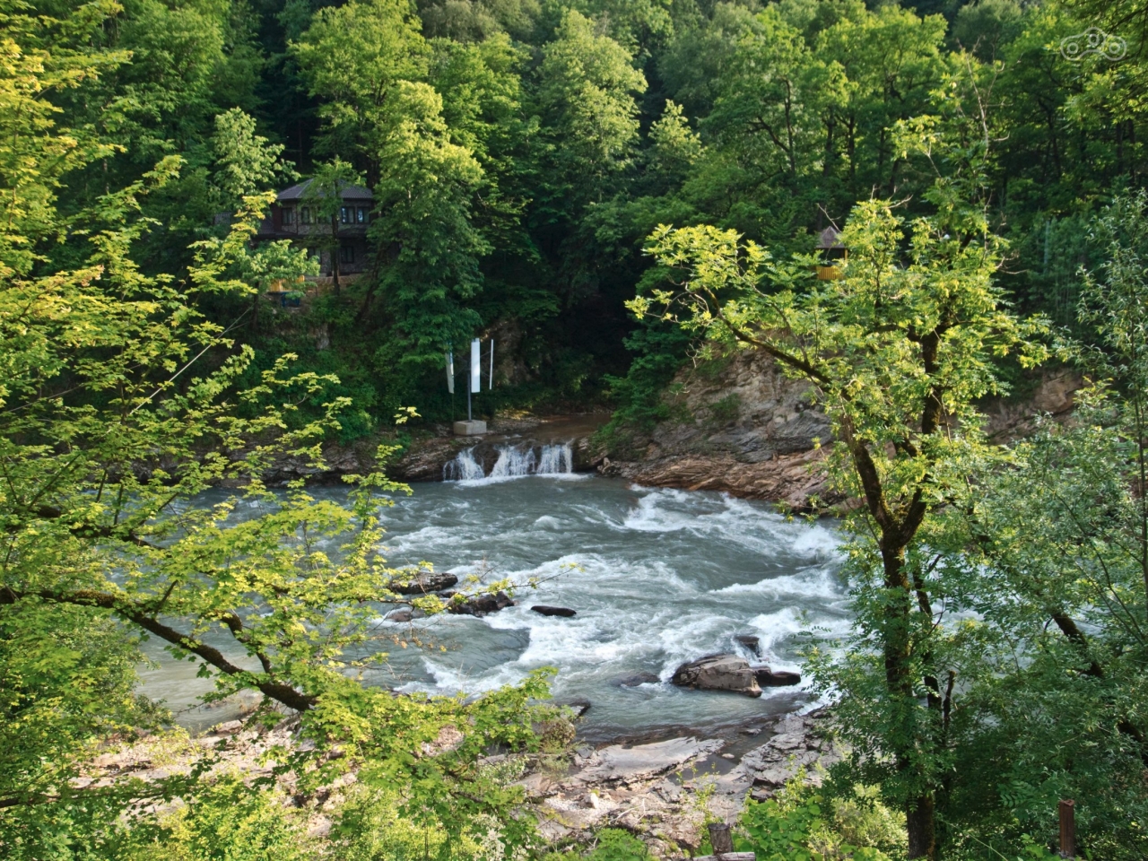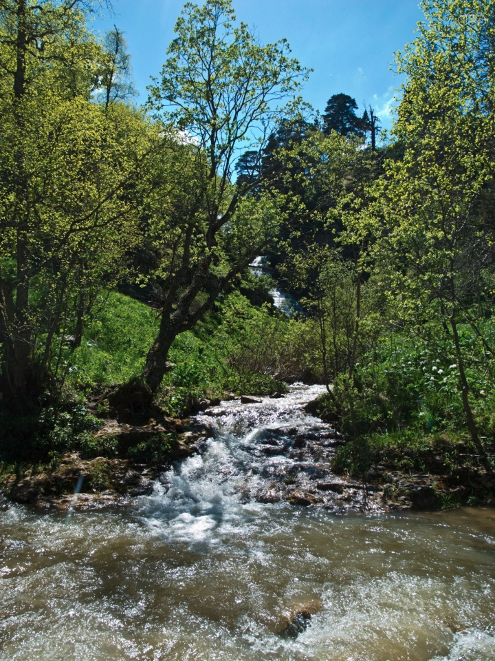 Я решил таки доехать до водопада в конце дороги, однако там оказалась площадка с кафе, а к водопаду нужно было ещё прилично топать пешком вниз. Можно конечно было попробовать проехать на мотоцикле. Но помятуя то, как моя резина себя вела на горе Богомольная на мокрых камнях, я отверг эту идею, т.к. даже в самом начале весь путь в сторону водопада был изрезан ручьями. Я выпил в кафе кофе и двинулся в сторону Майкопа.