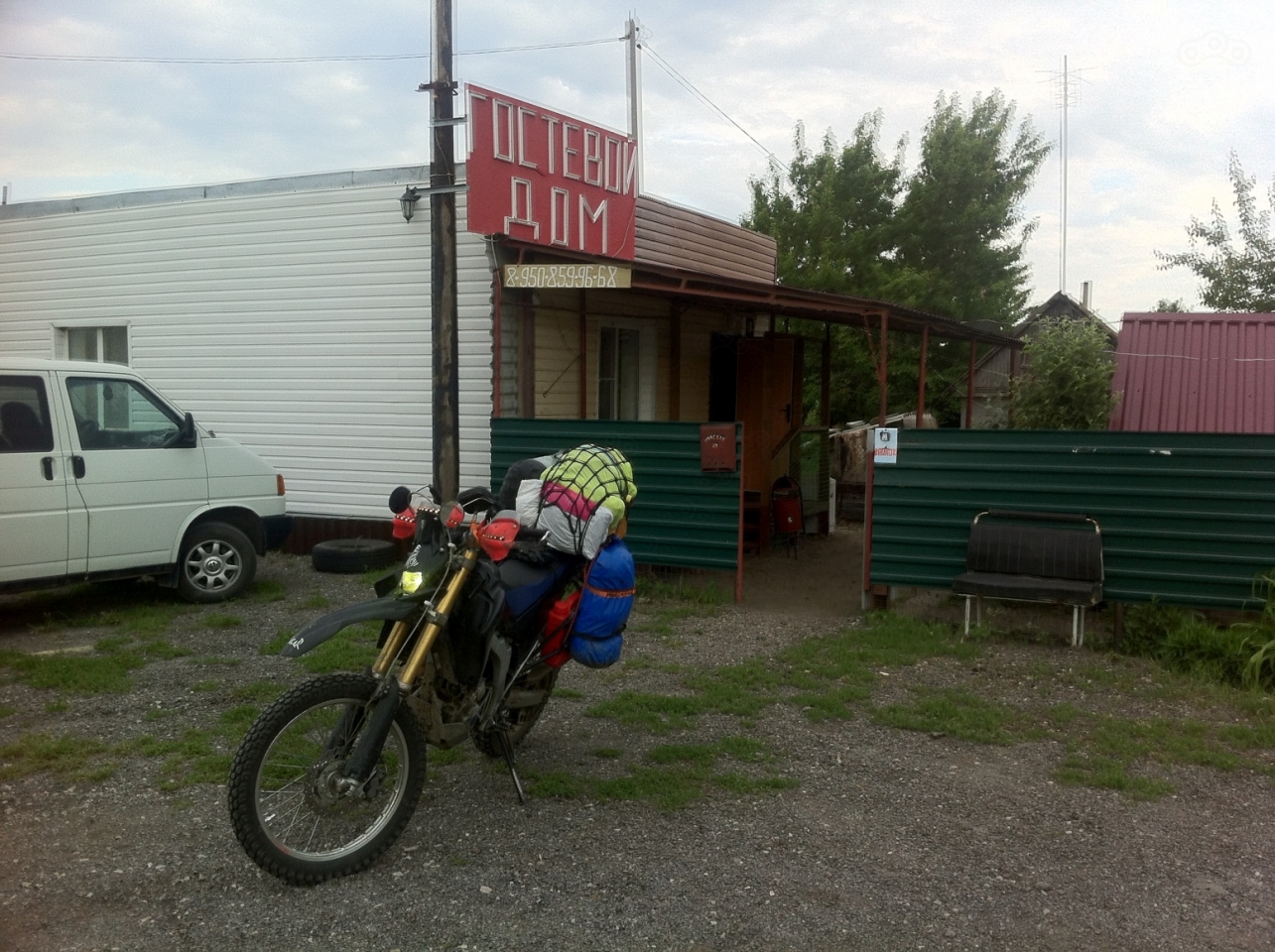 Я снова выбрался на трассу. Было уже темно, хоть глаз выколи, и я решил заночевать в какой-нибудь придорожной гостинице, плюнув на экономию. Вернусь домой – буду экономить, а сейчас надо отдыхать, иначе это будет не отдых. Тем более, что останавливаться оттирать каждые 15 минут мошек с визора совсем не комфортно, а трасса не освещена и сильно загружена трафиком (очень много фур). Я в очередной раз остановился, чтобы протереть визор, когда увидел мужчину, стоящего возле микроавтобуса с яркой светодиодной надписью «Гостевой дом». Он сказал, что ночёвка мне обойдётся всего 500 рублей, и мотоцикл можно загнать во двор, надо всего лишь свернуть и проехать «за воооон ту гостиницу». И действительно, за гостиницей оказался гостевой дом, где меня встретила его супруга. Хозяева сдают гостевой дом проезжающим, сами они при этом живут в сарайчике. В гостевом доме с 3 комнатами по 2-4 кровати, туалетом и горячим душем никого кроме меня не было – не сезон. Я выбрал себе комнату, принял впервые за поездку горячий душ и завалился спать, поставив гаджеты на зарядку.