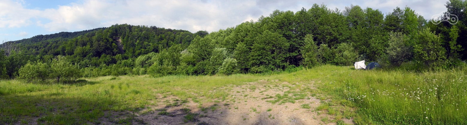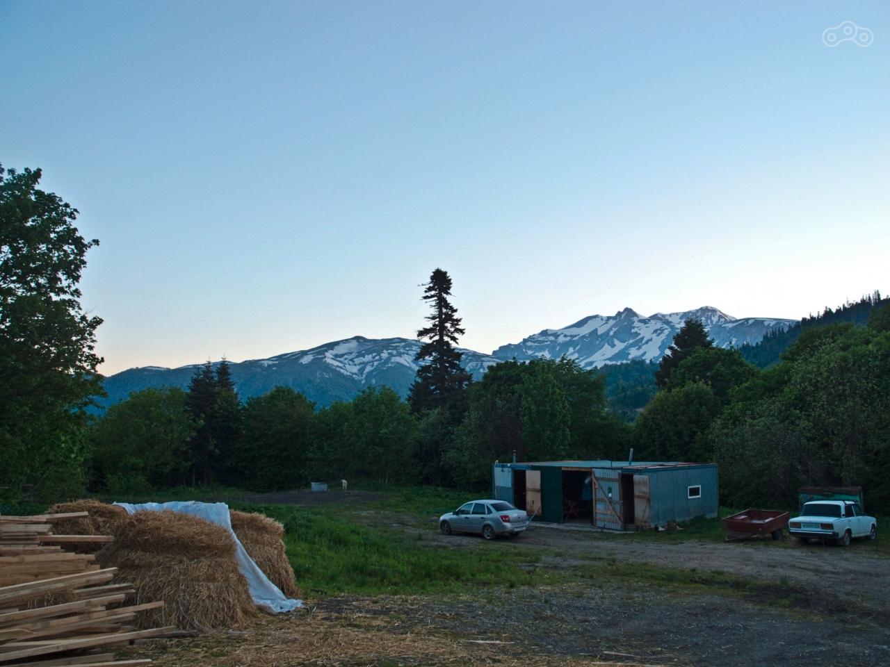 Постепенно начинало темнеть, и я понял, что до Сочи доехать я никак не успею при всём желании, надо искать место для ночлега. Проезжая по горной дороге, я съехал на луг возле сельхоз рынка, но мне не понравился глинистый грунт – в случае дождя выехать оттуда потом было бы не легко. Проехав чуть дальше, в районе Молдовановки я увидел плавную грунтовую дорогу наверх и свернул туда. Широкая грунтовка петляла вдоль леса, в который периодически уходили колеи от тяжелой техники, по всей видимости лесозаготовительной. Пару привлекательных полянок пришлось пропустить, т.к. там стояли таблички «Место занято под пасеку», а ночевать рядом с пчёлами мне идея не нравилась. Проехав около километра, я наткнулся на какие-то деревянные строения, похожие на жилище толи лесника, толи лесорубов. Но чем дальше я забирался, тем чаще попадались лужи, а дорога становилась разбитее от колёс тяжелой техники. Я немного вернулся назад и таки обосновался на одной из пасечных полян, спрятавшись за кустами от обзора с дороги. Место было очень приятное, поросшее ромашками. Пчёл не было. Неподалёку виднелись старые поросшие травой следы от авто, уходившие куда-то вниз, вероятно к реке, и кострище с кирпичами – место пикника.