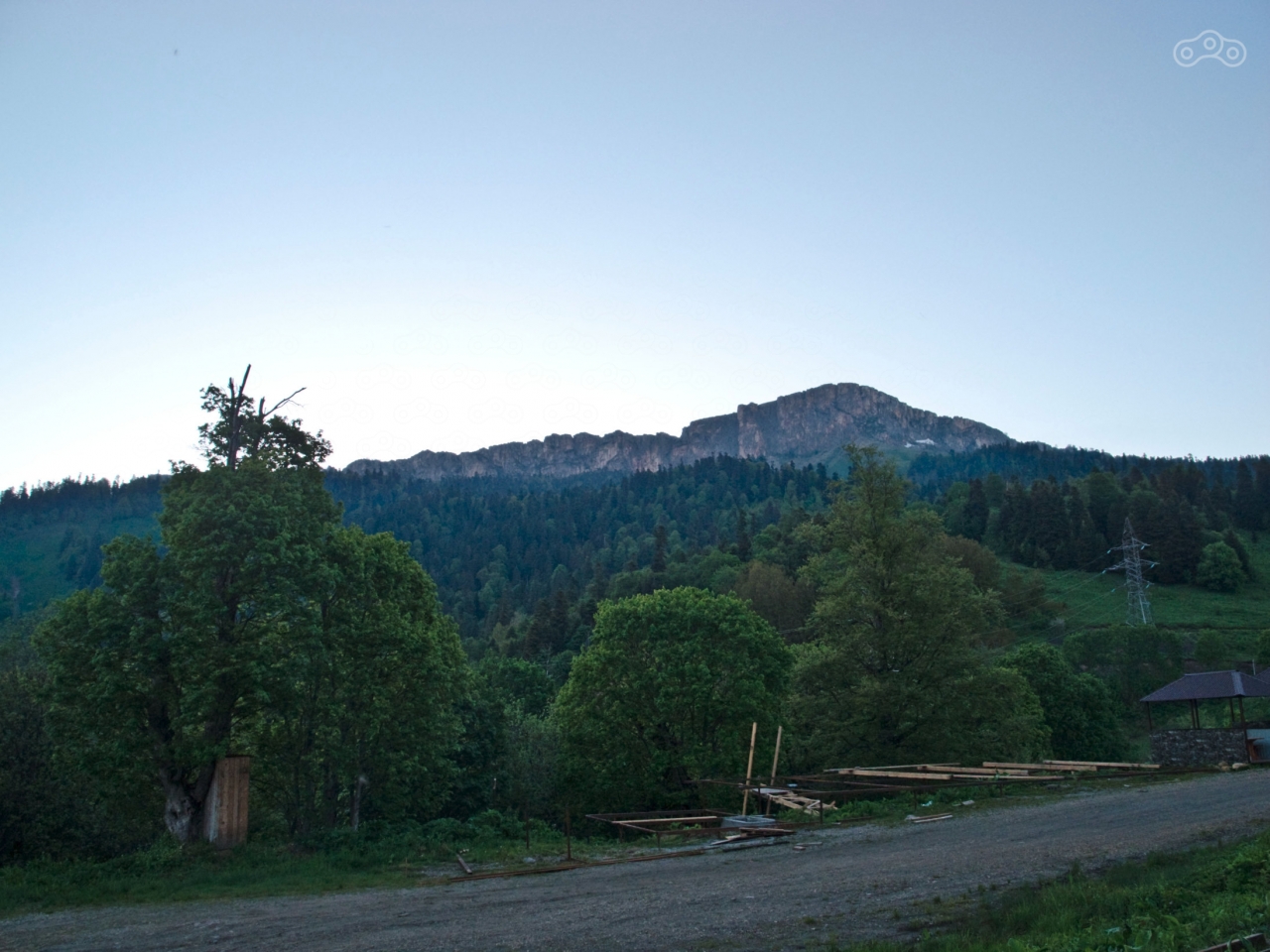 Уже смеркалось, когда я подъехал к небольшому озерцу на высоте порядка 1500 метров над уровнем моря, где на яндекс-карте значится гостиница Партизанская Поляна, а в MAPS.ME место обозначено как «вид на Оштен». Я посмотрел на висевший замок на двери гостиницы, на ясную, пусть и не жаркую, погоду, и подумал, что где-нибудь посплю в палатке. Однако в Адыгее, как пишут в интернете, нельзя ставить палатки где попало. Если егеря засекут, то штраф 2500 рублей. Особенно это проблематично в районе Лаго-Наки. Там много кемпингов и можно поставить палатку в кемпинге за 150 рублей. Прямо напротив гостиницы за озерцом как раз строился кемпинг, а рабочие обедали в одной из беседок. Я спросил, работает ли уже кемпинг, мне сказали, что нет, но разрешили поставить палатку бесплатно где мне больше понравится. Я выбрал место на искусственной насыпи, где лежали стройматериалы. Лучшее место для ночёвки и придумать было сложно – вокруг фантастической красоты горы, частично покрытые снегом, и плато, живописно освещаемые закатными лучами солнца. И практически полная тишина... Только собака в будке долго ещё лаяла в сторону леса. Видимо там бродила какая-то животина. Единственное, что при выборе места для палатки я не подумал о том, как я буду в эту насыпь из гранитной крошки колышки заколачивать. )))