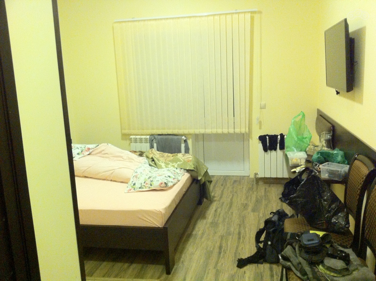Я вернулся на дорогу и доехал до Терскола, где потыкался в местные гостиницы, прекрасно понимая, какой мне сейчас заломят ценник. Как и ожидалось, цены начинались от 2500 рублей за номер. Однако ночевать в палатке у меня не было никакого желания –было совсем не жарко, да ещё и мокро после грозы. С третьей попытки я вселился в гостиницу Купол за 1500 рублей за номер. Мне сделали скидку в виду того, что не сезон. Летний сезон в Приэльбрусье с июля по сентябрь. В номере был горячий душ, работающие батареи, и даже LED-телевизор, и сейчас мне очень всего этого не хватало (кроме телевизора - на кой чёрт он мне сдался?). Я простирнул накопившееся грязное бельё и развесил по батареям, поставил сушиться мокрые мотоботы и раскидал по розеткам гаджеты, после чего упал на кровать и уснул мёртвым сном, успев только подумать, что утром найду жильё побюджетнее.