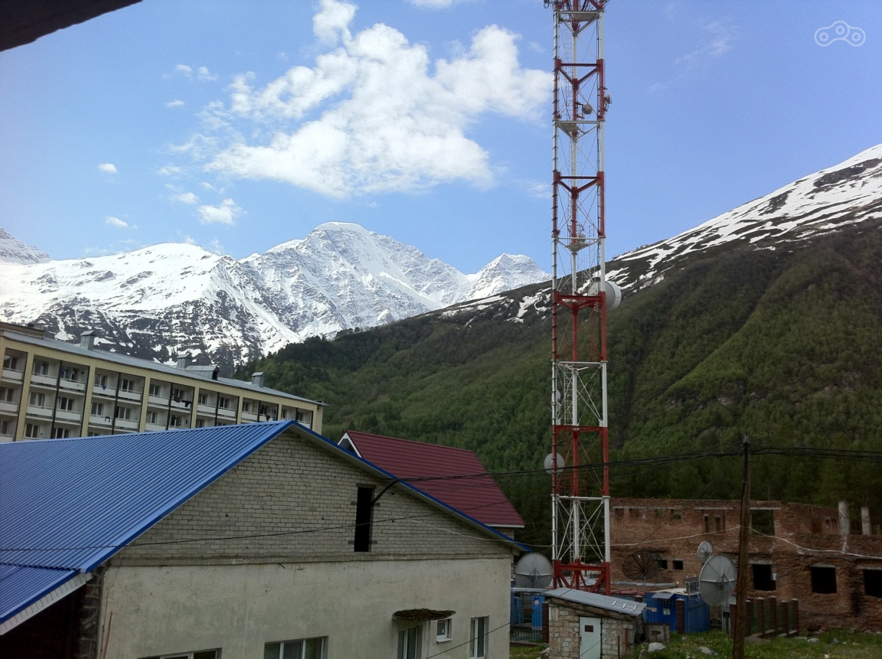 На подъезде к Терсколу дождь закончился. Я остановился в указанном знакомцем месте в поисках нужной гостиницы, но катастрофически не мог найти то, что он мне описывал. Вокруг стояли все здания, которые должны были стоять, кроме того, которое нужно. Я задолбал его звонками, в итоге он выключил телефон. Ту самую гостиницу я так и не нашёл, есть подозрение, что её просто уже снесли, т.к. примерно там, где она должна была располагаться, находился подземный гараж и строительная площадка.