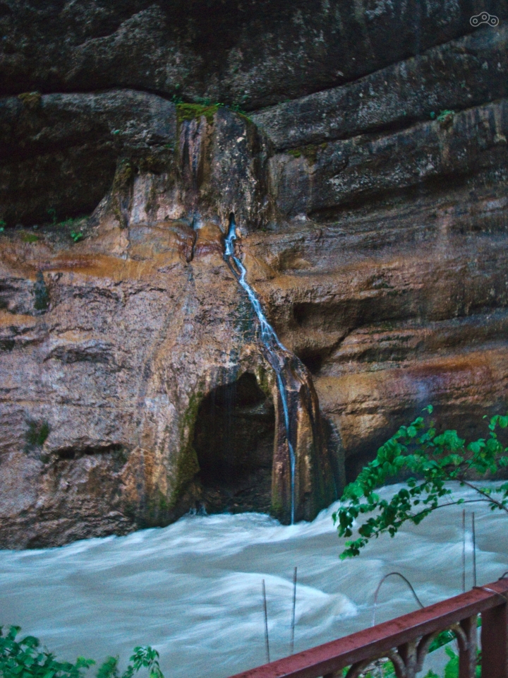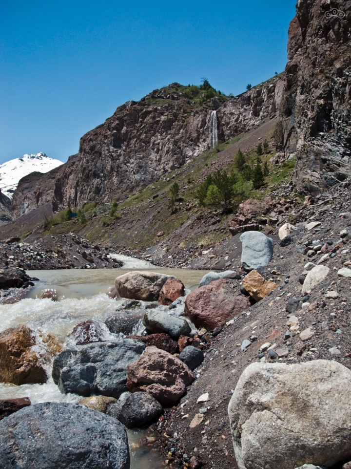 Кто не прогуливал в школе физику, тот должен знать, что при низком атмосферном давлении и небольшом содержании кислорода в воздухе процессы кипения, таяния и замерзания происходят при других температурах – вода закипает раньше, а снег тает позже. Наконец я дошёл до крутого поворота, от которого шла узкая тропа к водопаду. Водопад выглядел шикарно, однако я не рискнул к нему идти, потому что на такой высоте, а водопад находится на высоте 2747 метров (точнее не сам водопад, а я находился на этой высоте), и у меня с непривычки стала кружиться голова. Я присел на камень, а мимо меня бодро проскакали пятеро пацанов разного возраста, сопровождаемые отцом. Отец указал одному из них на скалу возле водопада и сказал «Смотри, тур!». И действительно, слева от водопада на скале стоял горный козёл и смотрел на нас. Судя по разговору, там был ещё и второй, но я его не разглядел. Я немного пришёл в себя, но всё же не рискнул топать к самому водопаду с головокружением по узкой тропинке, решил ограничиться видом издалека. Пацанята же не только облазили всё у подножья водопада, но и в мгновение ока забрались наверх, где ещё недавно мы видели тура.