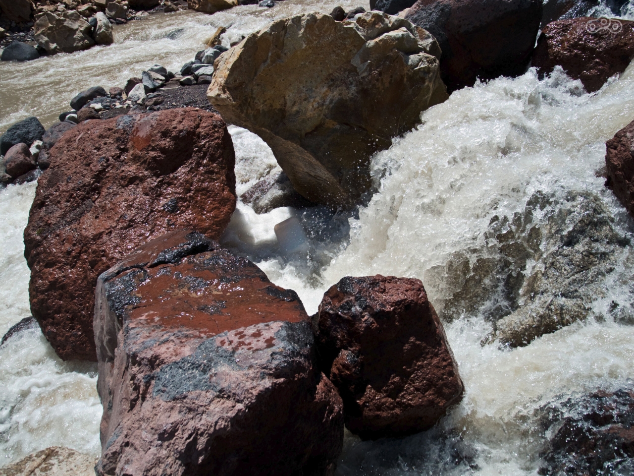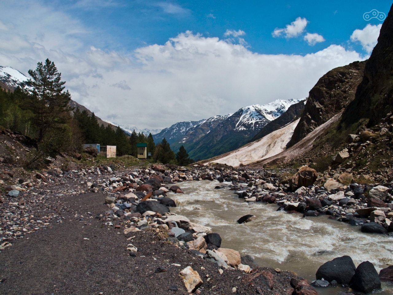 Я дошёл до конца грунтовой дороги, сделал несколько фотографий, насладился видами и шумом реки. В глаза бросилась попавшая в западню канистра для воды, которая болталась между камнями порога, подбрасываемая бурным течением. Но траектории были таковы, что её всё время возвращало назад. Эта канистра прямо таки символизировала всю тщетность бытия в круговороте циклов жизни. Я вернулся к будке и увидел, что по низу тоже идёт пешеходная тропа. Я спросил, есть ли там проход, и рабочие ответили утвердительно. Дальше по тропе оказались развалины какого-то жилища, судя по всему военного назначения, со сложенными из камней стенами, турником между деревьев и табличкой «Оружие шуток не любит, ошибок не прощает». Я вернулся к мотоциклу и встретил там местного жителя. Как оказалось, в Терсколе уже чуть ли не половина посёлка знает о моём там пребывании и даже где я живу. Мы немного побеседовали, и я двинулся к следующей точке маршрута.
